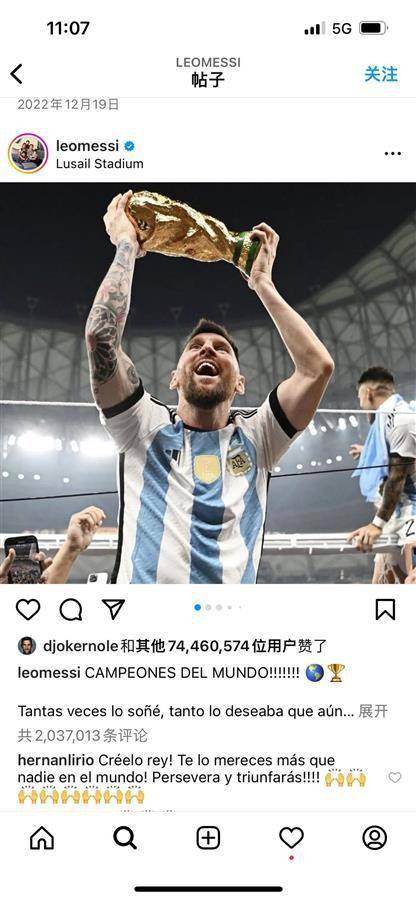 据悉,梅西捧着假奖杯拍了大量照片,甚至还被他上传到社交媒体。其中,梅西在instagram上发布的自己手捧大力神杯的照片,迅速成为该平台体育类点赞数第一,点赞数已近7500个,成为该平台点赞数最多的照片。