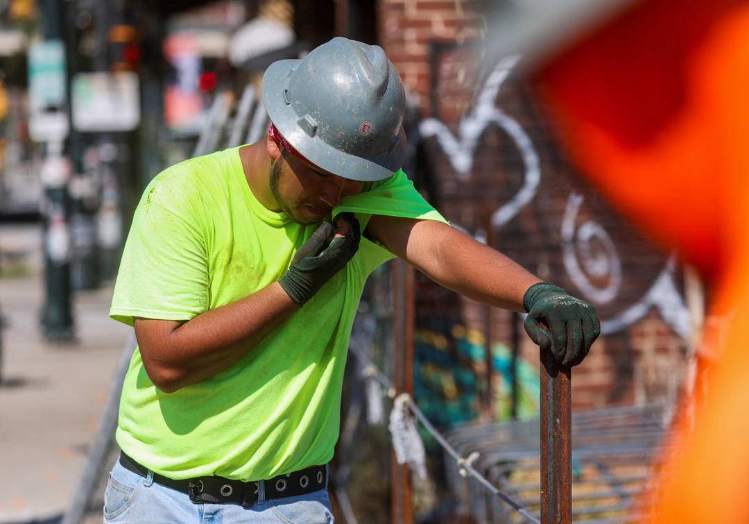 当地时间2023年8月21日,美国佐治亚州亚特兰大,高温热浪持续,建筑工人仍坚守岗位辛勤劳作。