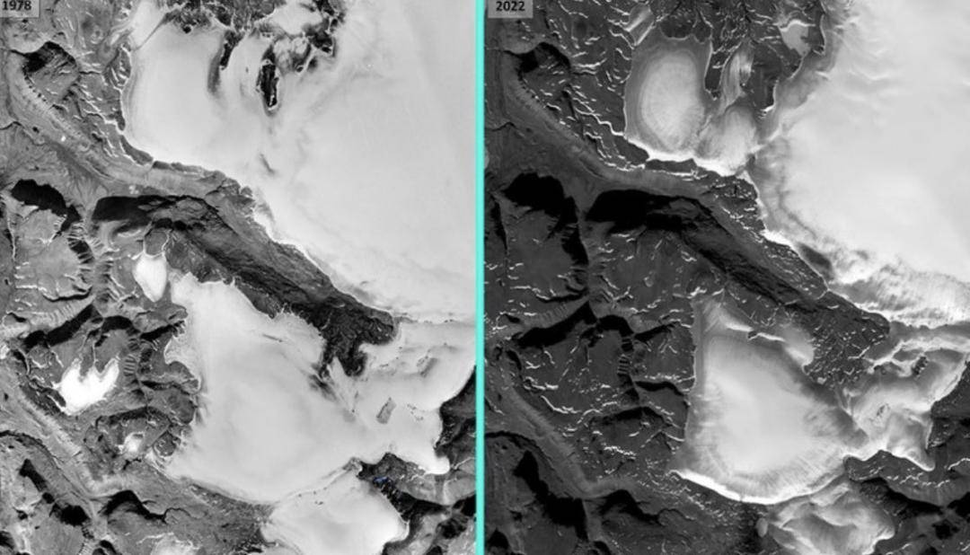 1978年至2022年卫星图像显示格陵兰岛北部冰川变化