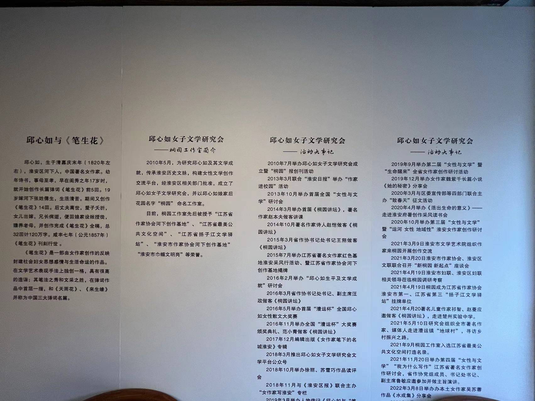 古镇是清末著名女作家邱心如的故乡,她创作的长篇弹词作品《笔生花》与《天雨花》、《来生缘》,并称为中国三大弹词名篇。“桐园”,是邱心如娘家的后花园。如今,当地以“桐园”命名了一间工作室,作为邱心如女子文学研究会的创作基地。我们走进古色古香的“桐园”,受到当地的一位女作家的热情接待。她介绍了基地的创作成果,以及获得的“江苏省最美公共文化空间”、“江苏省扬子江文学驿站”荣誉称号等,我们连声称赞。告别时,我们祝愿女作家为研究邱心如及其文学成就,传承淮安历时文脉不断做出新的贡献。