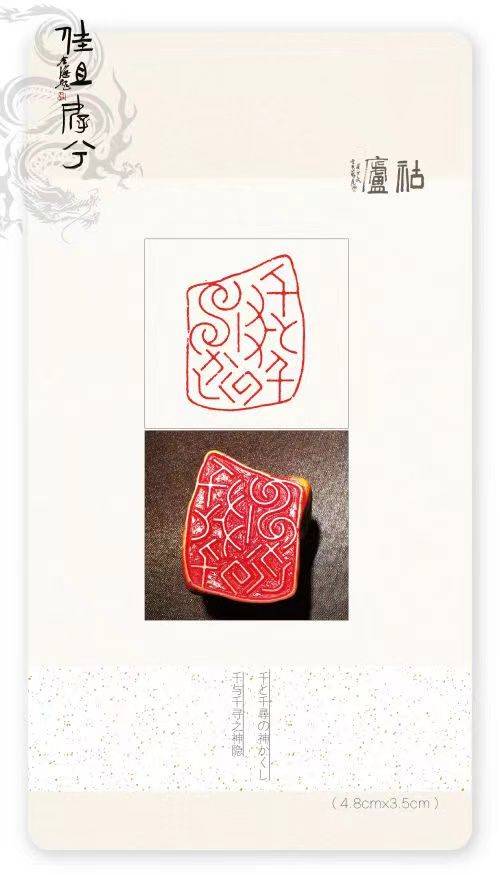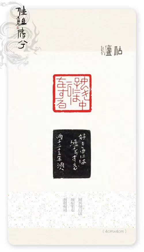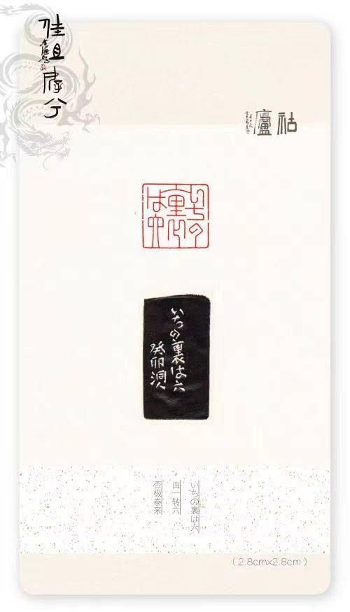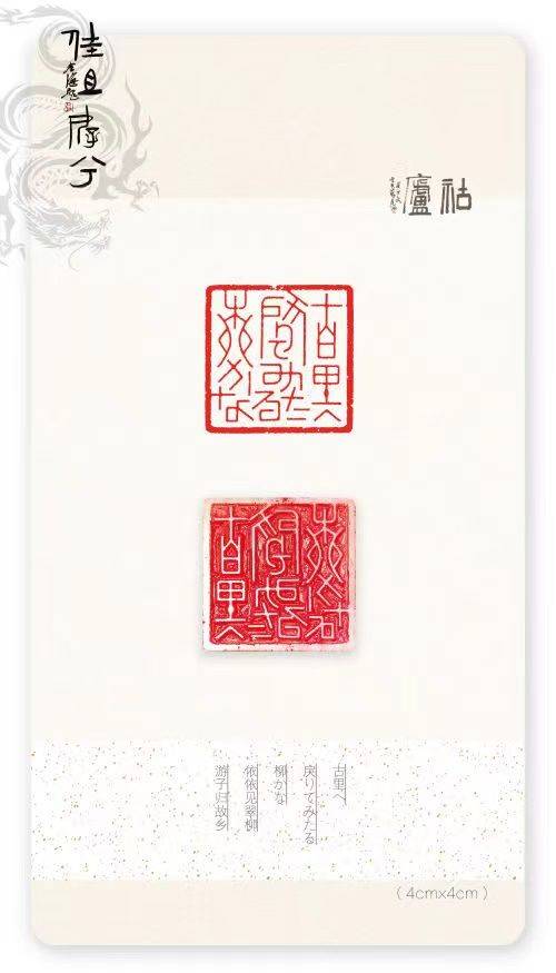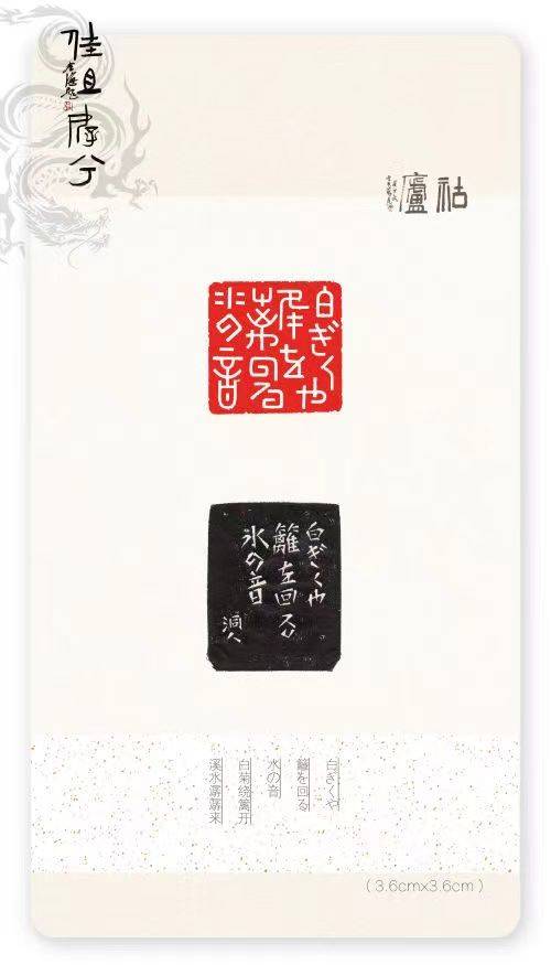 胡轮精通日文,创造性地将假名与篆文有机融合,印文多表现日本诗词、谚语等,形式上极具抽象意味,加之对多字印有心揣摩,开阔了艺术视野,拓展了篆刻疆域,确立了另辟蹊径的发展方向。读其篆刻作品,倍感韵味悠长且气息典雅,有装饰美,有现代性,有仪式感,一如日式料理的精致、精美、精微。