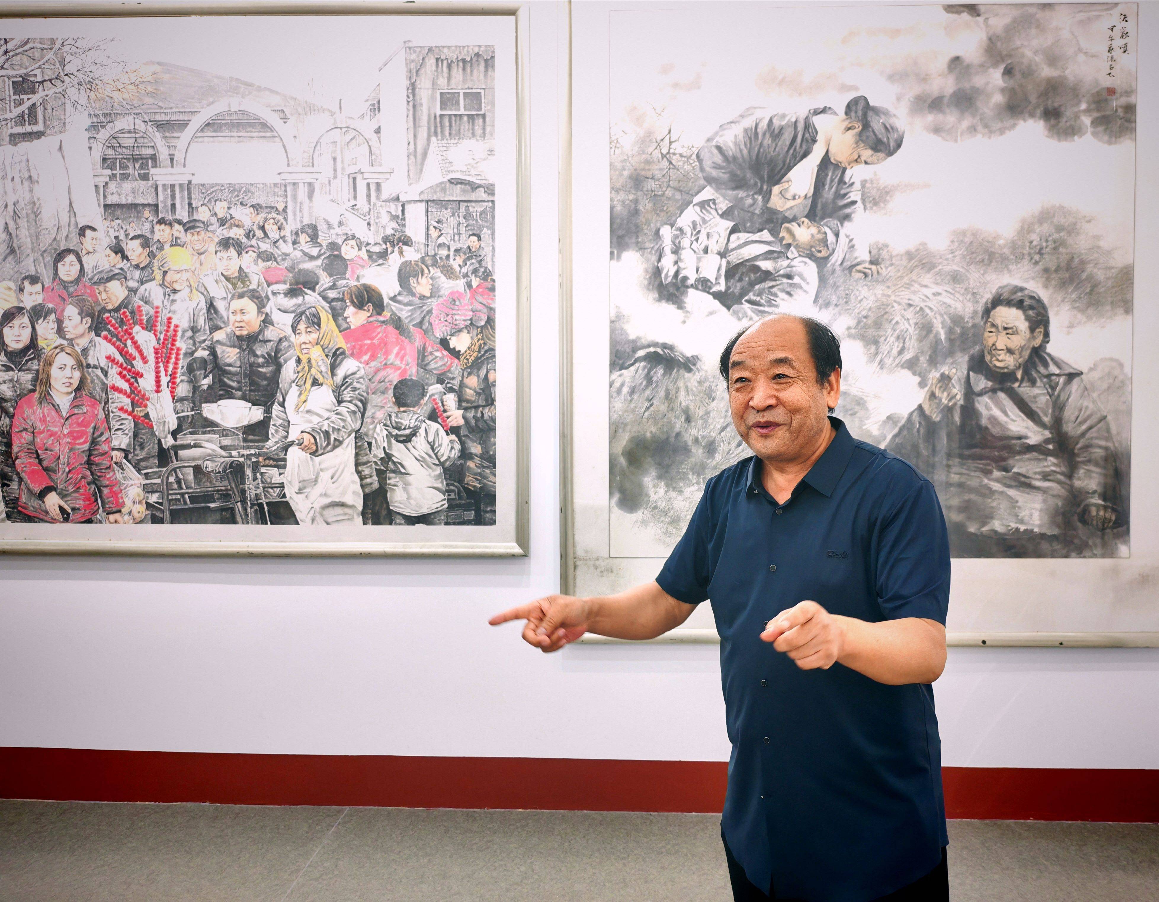 我们一行可以用“泪眼婆娑”四个字,形容日照之行观画的感受。我用相机留下了沂蒙画这棵铁骨铮铮的大树。陪同我们参观的莒县县委常委、宣传部长、副县长何玉晓用诗一般的语言告诉我,沂蒙画派的领军人物叫何乃磊,光明磊落的磊,名字里每一块石头都含钙,也含磷,他直接点亮了希望。