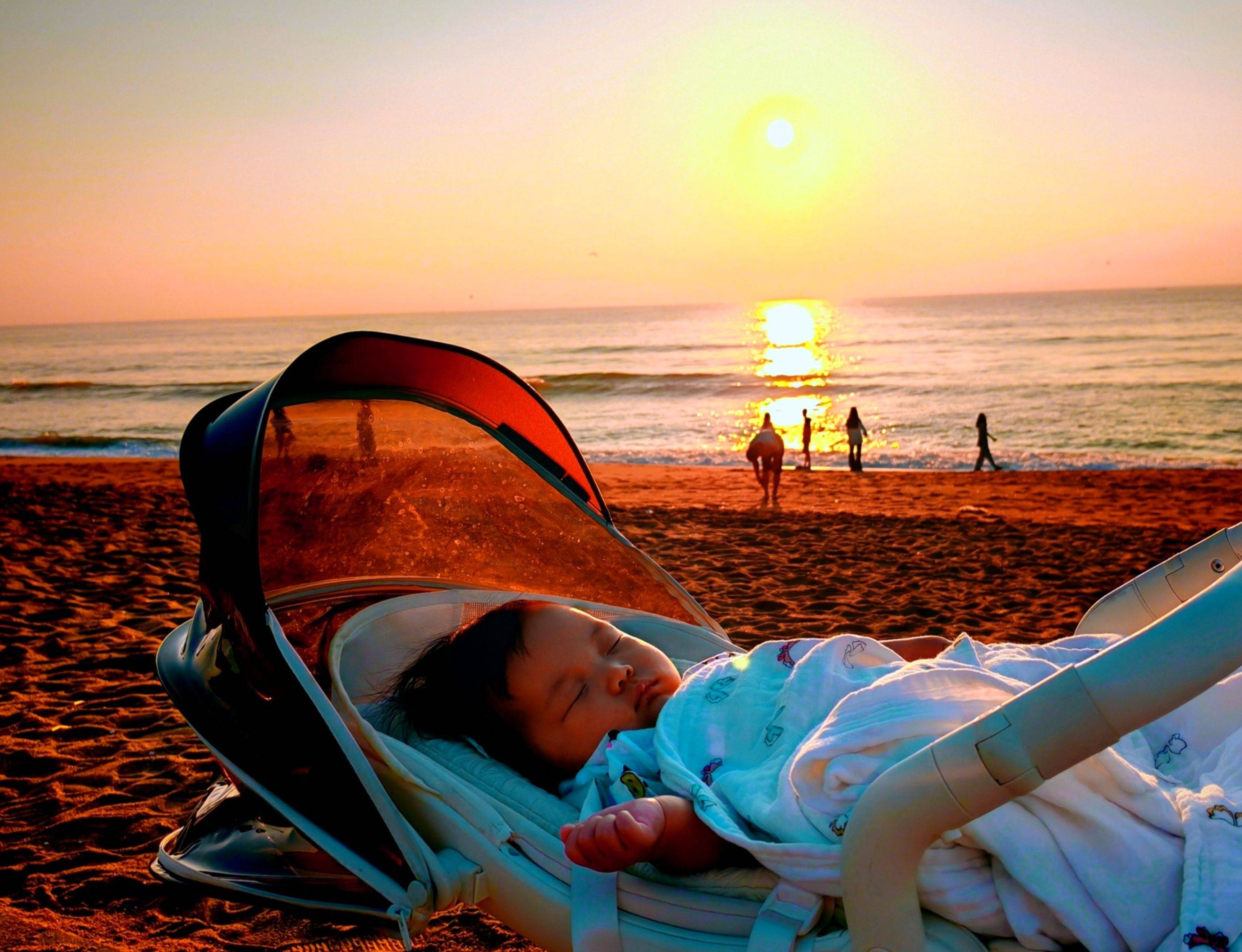 日照的日出,是一帧令人过目不忘的油画。这油画里有一幅特写,美得像一朵含苞欲放的茉莉花:岸堤上,一辆小巧的手推车,靜静歇在一旁。一位熟睡的婴儿正沐浴在早霞中,那么安详甜美,像一把小提琴演奏着童年的梦。我举起相机,留下这唯美的瞬间。