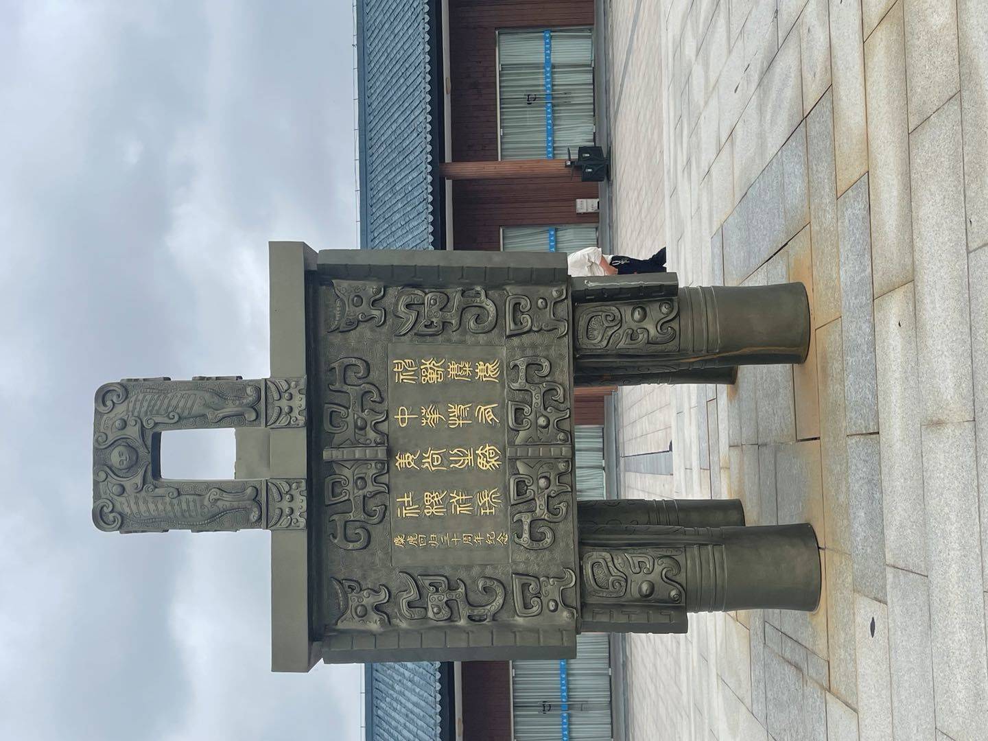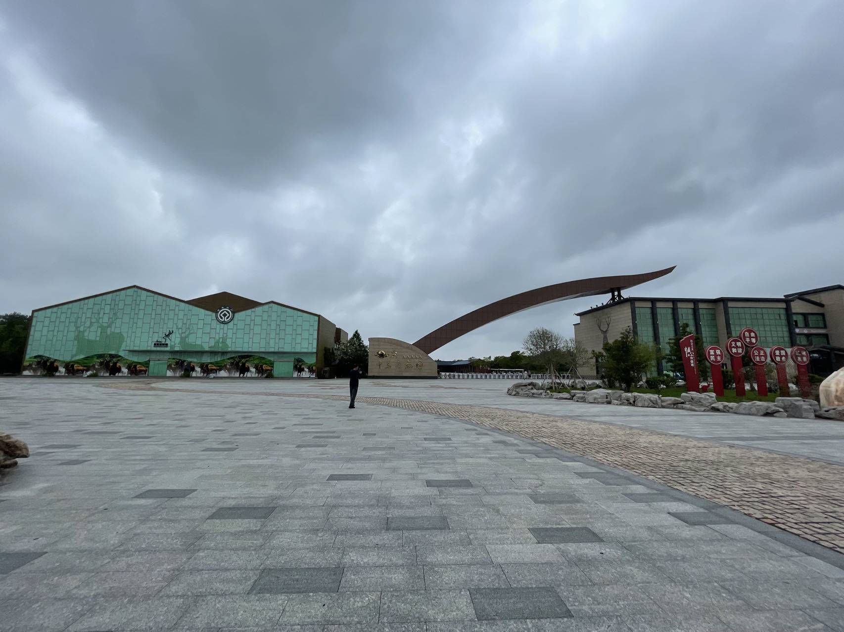 大老远就看见了它安稳地卧在乌云下的大门,左侧麋鹿博物馆装饰着淡绿色玻璃山墙,上半部分印着或单或双的草绿色麋鹿水印,下半部分装饰着成群的麋鹿彩色画像;右侧的大门主体由一个扇形切面和一支至少20米长的带弧度斜伸出去的横梁组成,切面和横梁仿佛是鹿头的侧面抽象画,切面是鹿脸,横梁是鹿角;鹿脸上的金色logol图案好像是一只鹿眼,旁边的5个“A”字就像是泪槽,鹿眼和泪槽下方是斗大横排草书金字“中华麋鹿园”,像鹿脸上的大花斑纹,笔意都带有粗犷的味道。