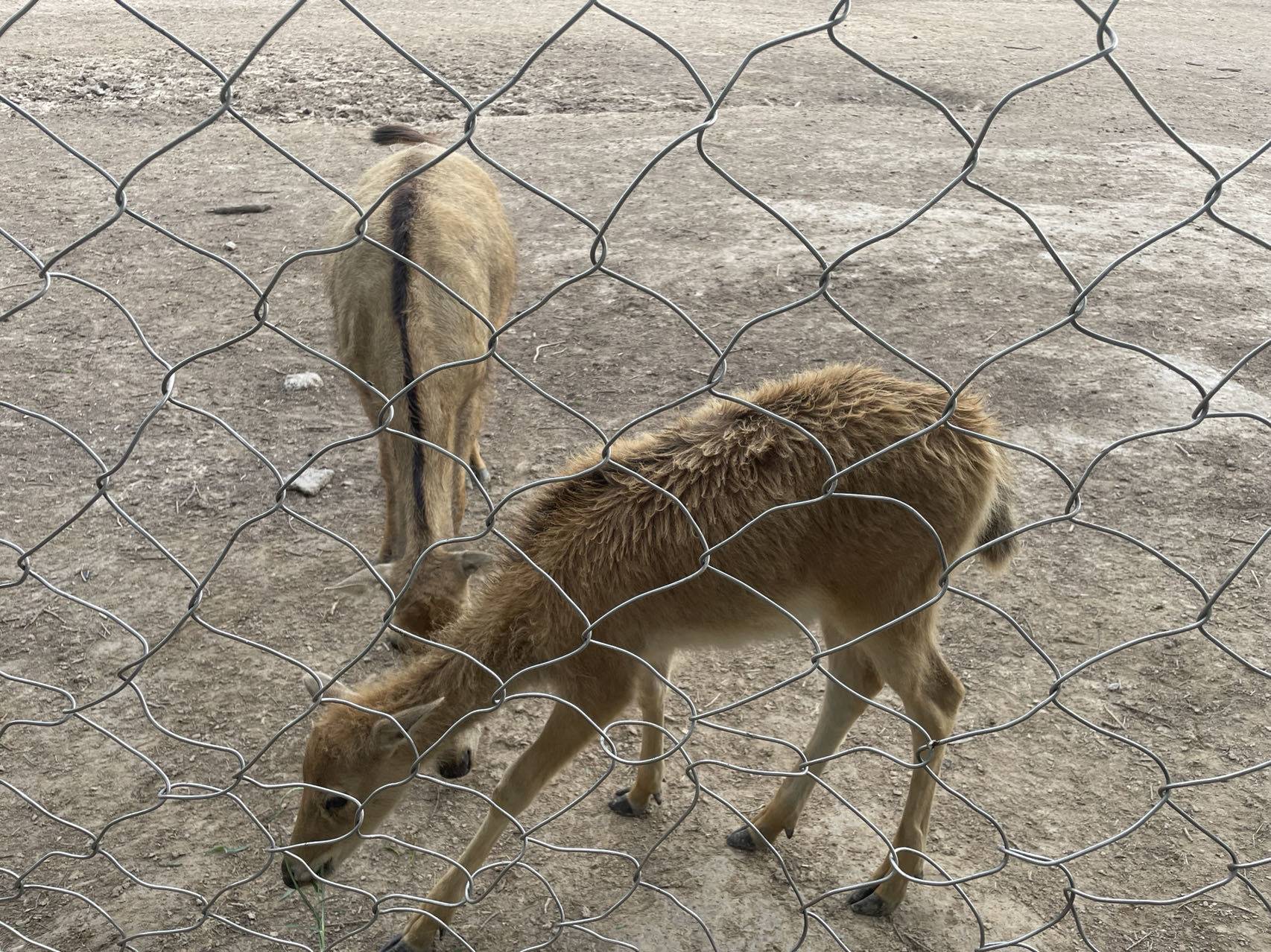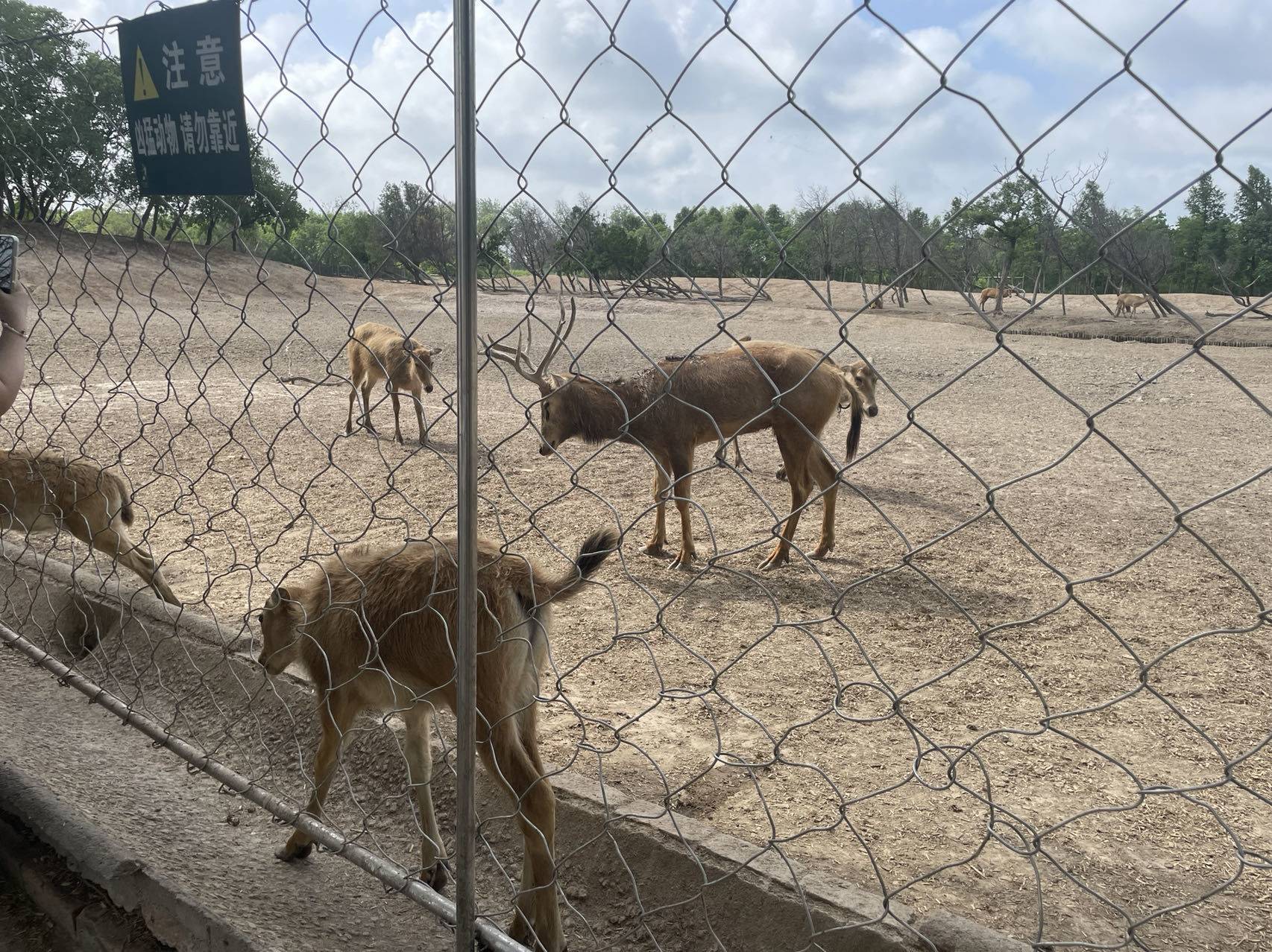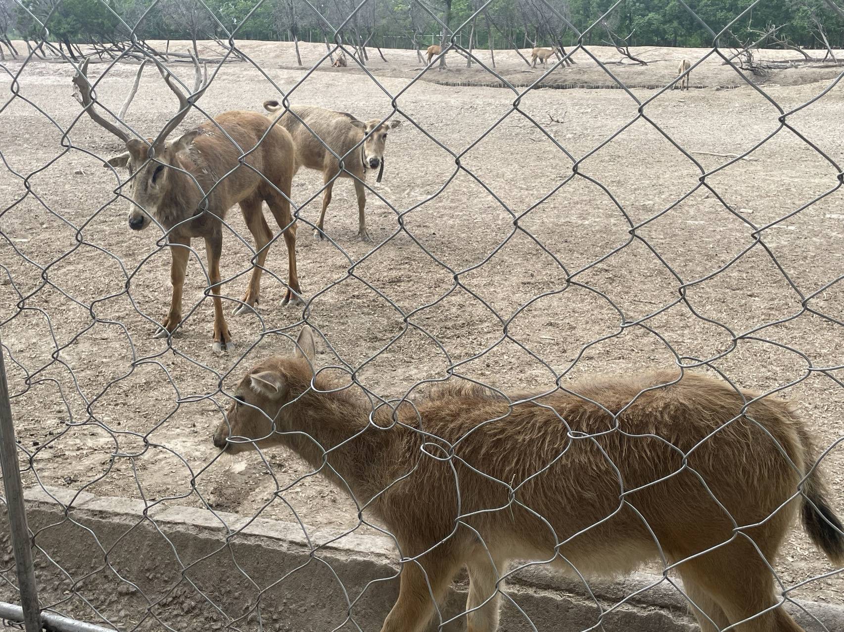 从观鹿台下来往回走的时候,我在右边的那个园子里看见一只瘦弱的小鹿,很胆怯,我采摘了两把草示意他过来吃,它却不敢过来。我把草扔进围栏里的地上,它犹豫了很久,才蹒跚着走过去吃起来。我很担心它病了,但愿它能健康成长。游览过程中,每当听到公鹿们的嘶吼声,我就会想:它们是在求偶呢,还是在乞食呢?我不知道,只有它的妻妾和孩子们懂吧。不过,看着它们徜徉其上的戈壁滩一样的土地,我着实有点心疼,从心底觉得圈养麋鹿的场地环境堪忧。不知道它们生活的大地是否该百草丰茂——我心目中“呦呦鹿鸣,食野之苹”的情境不应该是眼前这样的呀。