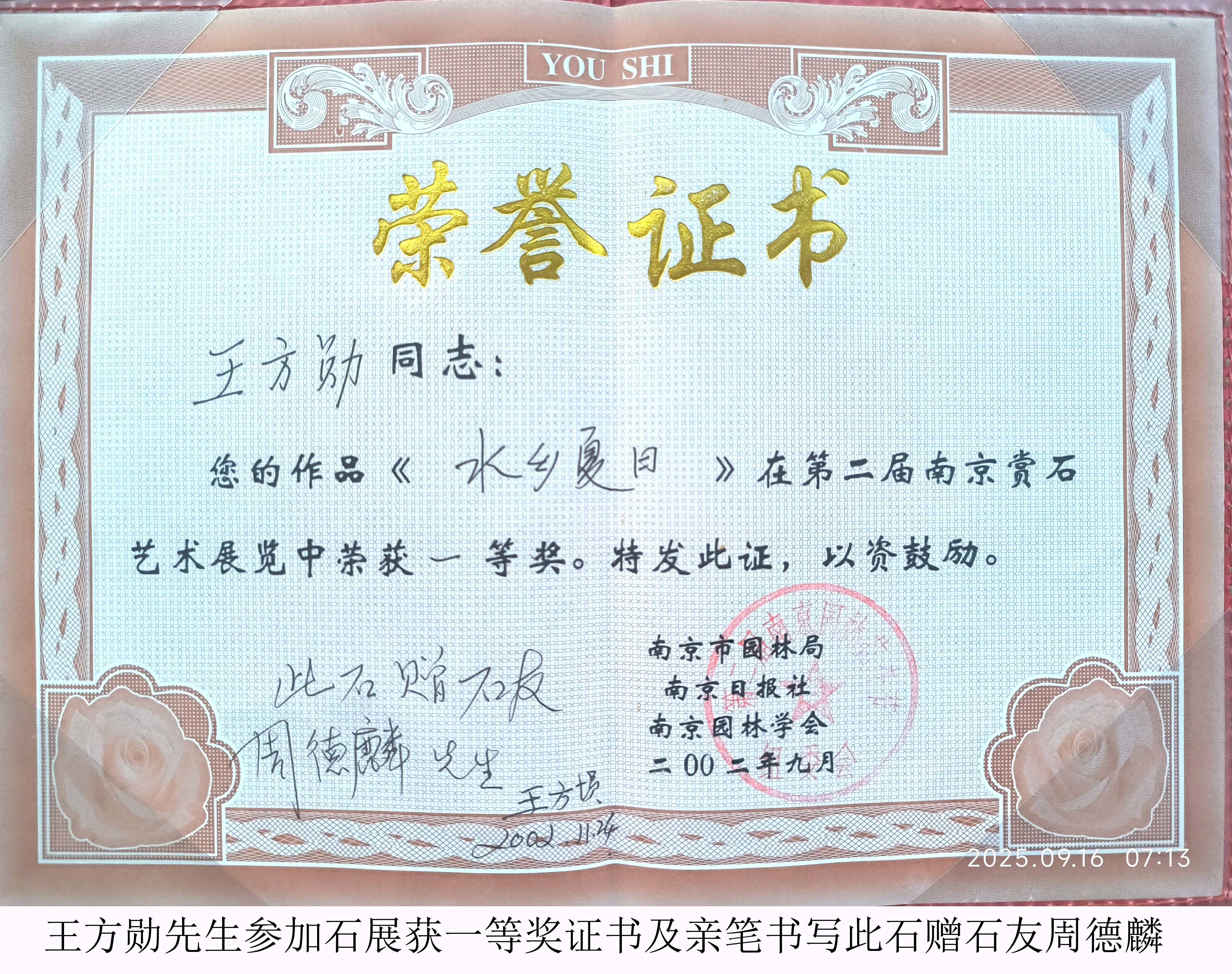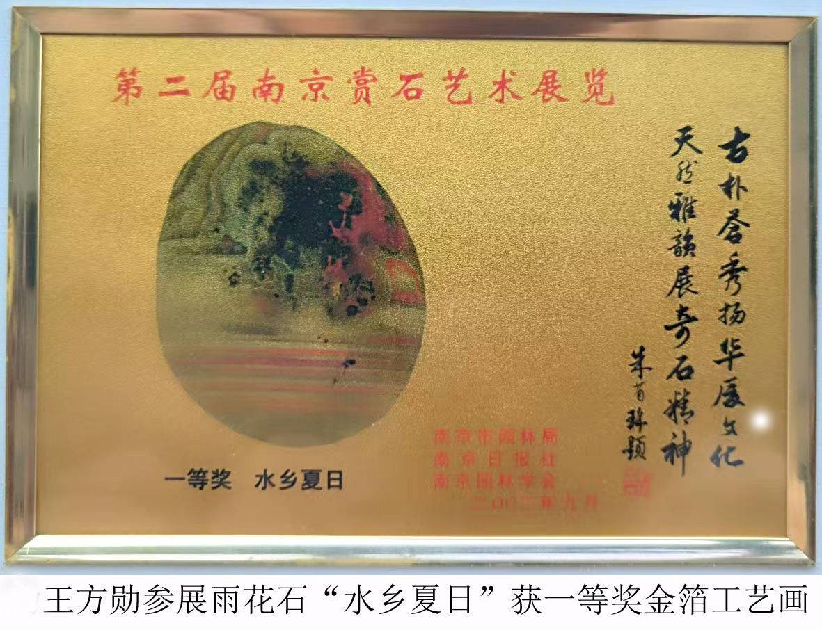 在友谊和雨花石面前他又会选择什么呢?1999年南京雨花石协会要出版一部《中国南京雨花石收藏家精品大观》大型画册。我曾多次诚恳邀请王方勋先生,向协会提供出版画册的雨花石照片,参加到这项活动中来。并向其介绍说,这是南京雨花石协会自1984年建会以来,第一本由协会编印的画册意义重大,虽多次在各种场合与其谈到此事,但他都以自己个人正筹备出版一本雨花石画册而婉拒。直到该书于2000年出版发行了,他也没参与该次出版活动,令我感到十分惋惜。但王方勋先生对我想促成他参与出版该书的事,一直记在心中,他多次欲送一枚雨花石给我以表谢意,但也毫无例外的被我婉拒。2002年11月26日,王方勋先生来到我家,他郑重的拿出一本雨花石参展荣誉证书给我看,我打开证书一看,上面写着“王方勋同志:您的作品“水乡夏日”在第二届南京赏石艺术节展览中荣获一等奖,特发此证以资鼓励。南京市园林局、南京日报社、南京园林学会2002年9月”。在证书内还有王方勋先生亲笔书写的,“此石赠周德麟先生,王方勋2002年11月26日”。再打开他带来的礼品盒一看,是一幅“水乡夏日”雨花石金箔工艺画,上面烫金字写着,“一等奖水乡夏日”。接着王方勋先生又拿出一只塑料袋,打开袋子后一枚“水乡夏日”雨花石赫然露出了迷人的斑斓色彩。王方勋先生说:“这是为表达对你的感谢,我多次赠石给你都被你拒绝,我之所以赠石给你,一是没忘记你,多次邀请我参与《中国南京雨花石收藏家精品大观》一书的出版活动;二是你与有关领导是好朋友,你没有利用这层关系为自己出版雨花石个人专集,而是把这难得的机会给了南京雨花石协会,给了协会所有会员,为大家出了画册,为宣传雨花石文化做出了贡献,这是我对你的敬意,请你一定要收下这枚雨花石”。王方勋先生把雨花石看的比金钱重,但同时他把友谊看的比雨花石更重。这充分的反映出他的高尚品质,让我终身难忘。