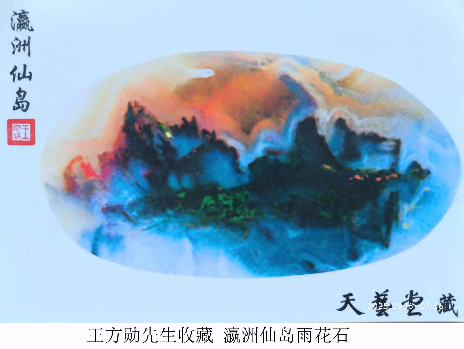 王方勋先生爱石、藏石一直有个梦想,即总结自己数十年来的赏石感悟,用自己收藏的雨花石出版一部雨花石书籍,为石友赏石提供借鉴经验,这一想法在他退休,没有了工作羁绊后显得更为强烈。他曾先后两次邀请我到他住处公教一村28栋502室家中,俩人共同商讨出版雨花石书籍之事,参谋选拔可入书的雨花石,还拿出了他的宝贝雨花石,“老虎”、“猴头”、“盘蟒”、“宇宙奇观”、“俄罗斯女郎”、“阿诗玛”、“桃红李白”、“宋元画意”、“莫愁女”……雨花石,总计两脸盆之多。如数家珍的一一介绍,谈到动情时他又拿起“宇宙奇观”雨花石对我说:“今后宇宙奇观这石就是我的陪葬品”。听他这爱石痴语令我心头一震,深感他对雨花石的情感是常人无法企及的。他拿出给我看的每枚雨花石都可说是精品,也可做为出版物。遴选后,他又请金石篆刻家,为他选出的雨花石分别刻出石名章。并请摄影师为每枚雨花石拍照,并准备好赏石文稿,一切都在筹备进行中。但天有不测风云,不幸的是他一日外出,突感身体不适猝死在外,这一突发意外的死亡,是他自己绝不会想到,就这么仓促地离开了他所热爱的雨花石,致使他正在筹备出版的雨花石书籍无法完成!真使人有“出师未捷身先死,常使英雄泪满襟”之感叹!家人得知他突然去世的噩耗如晴天霹雳,痛定思痛后家人想到应把他一生耗尽心血收藏的雨花石保管传承好。于是在家中四处寻找,找石友打听其收藏的雨花石下落,命运和他开了一个玩笑,随着他的去世,他所藏的珍贵雨花石也消失的无影无踪。回想他曾痴情的对我说过,“宇宙奇观这雨花石今后就是我的陪葬品”!没想到这真是一语成谶,如今他耗尽心血收藏的雨花石竟然不知所终,抑或是雨花石都陪伴他而去。对于他的雨花石未竟事业,石友都给予极大的关心,石友征争先生曾倡议,大家共同出资由他实施为王方勋先生出一本雨花石挂历来纪念他,以了王方勋先生多年的出书心愿,石友们纷纷响应,遗憾的是他的雨花石不知所终,连雨花石照片也无法获得。2005年《中国宝玉石资源大全》一书总编王实先生,邀请钟华邦先生、赵启斌先生和我写南京雨花石的文化、科学、市场相关内容介绍,恰巧这时我找到了王方勋先生多年前赠送给我的一幅“瀛洲仙岛”雨花石照片,我在文内附上了这张雨花石照片,聊补王方勋先生雨花石画册没能出版之憾。2014年南京雨花石协会出版了一本《名石集萃》,书中收录了石友提供的王方勋先生“阿诗玛”、“盘蟒”雨花石照片,告慰了王方勋先生的在天之灵。