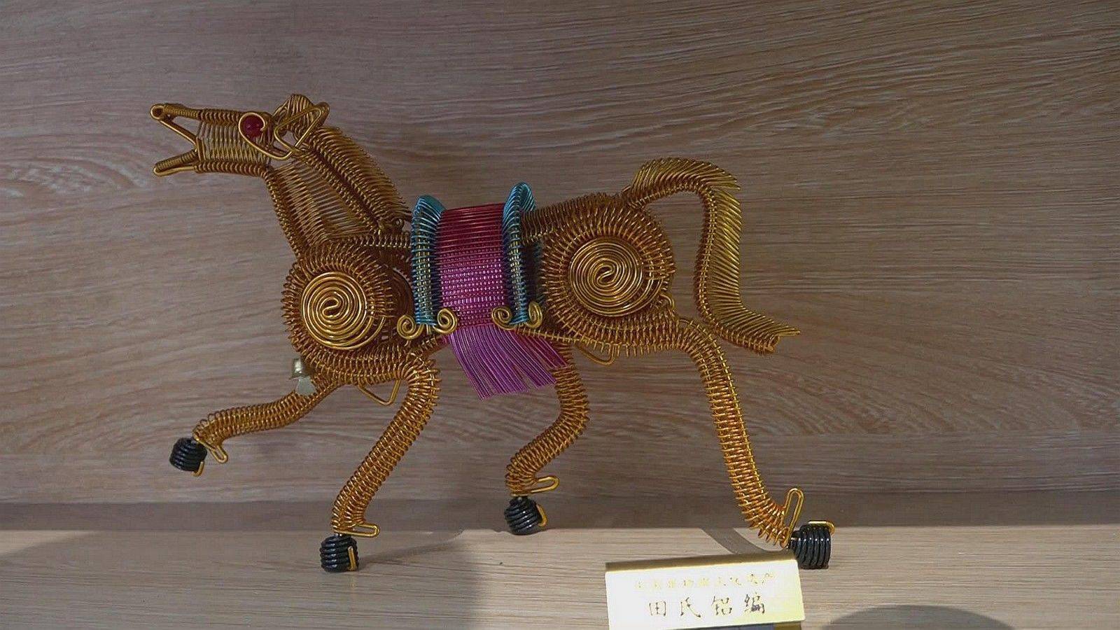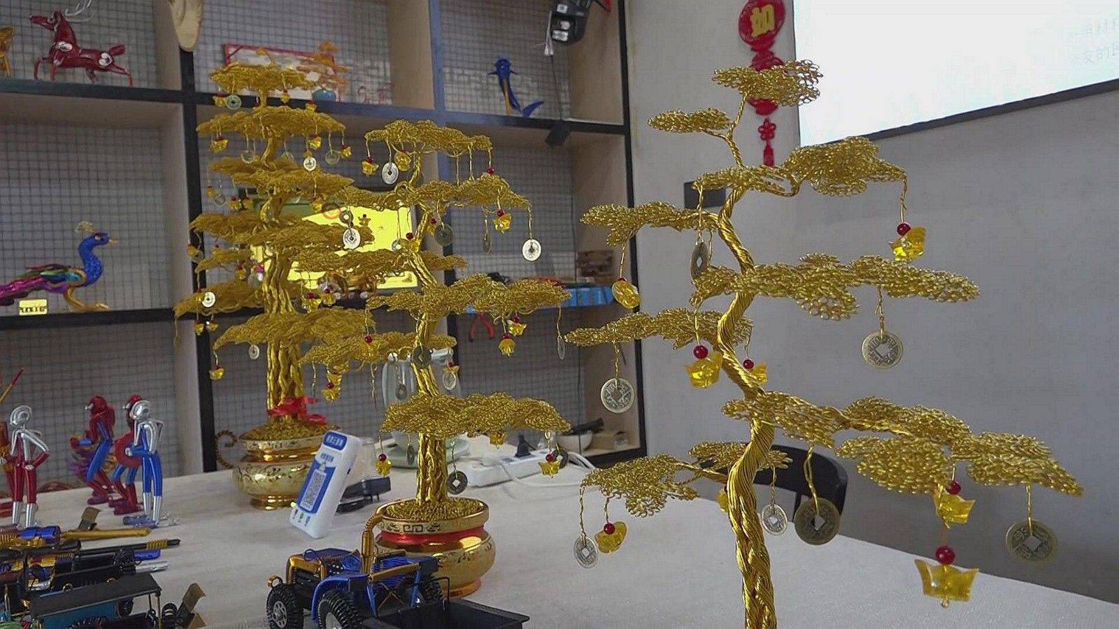 穆沟古生态村,位于江苏省盐城市阜宁县的西南,这里沟河纵横,水道交错。走进村子里,古道曲径通幽,绿水潺潺而流,伴着些许微风,一股股草花香扑鼻而来。在古村深处,一间挂有“阜宁田氏铝编”牌匾的古宅门前,几名游客正在挑选自己心仪的铝编手工艺品,一名中年男子坐在椅子上,手里拿着几根金黄色铝丝在不停地转动,时间不长,一支左轮手枪的雏形就展现出来。在室内的展示货架上,有踏蹄飞奔的骏马、有造型大气的腾龙、有色彩鲜艳的开屏孔雀,也有形状独特的“发财树”,每一件手工编织的铝编工艺品都栩栩如生,令人赞叹不已。