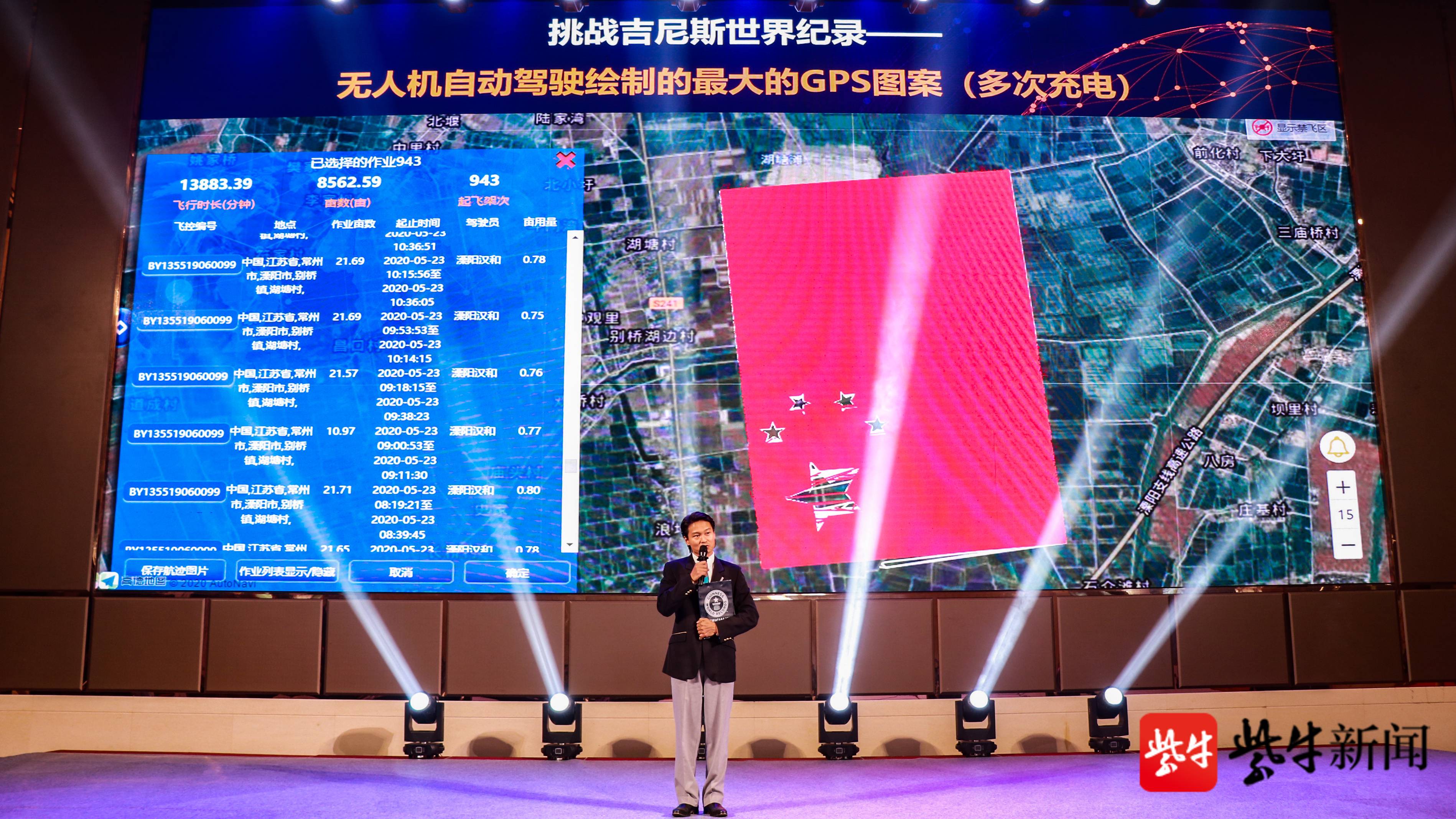 扬子晚报网12月26日讯 (通讯员 史珂 记者 毕俊星)近日,在溧阳汉和航空发布会上,吉尼斯世界纪录官方代表杨邵鹏宣布“无人自动驾驶绘制的最大的中国国旗图案(多次充电)”这一吉尼斯世界纪录正式达成:“经过之前5个月的挑战,以及对挑战过程和数据结果的认证,确认最终组成图案的航行距离是5020.92公里。我谨代表吉尼斯世界纪录宣布:恭喜你们挑战成功!”