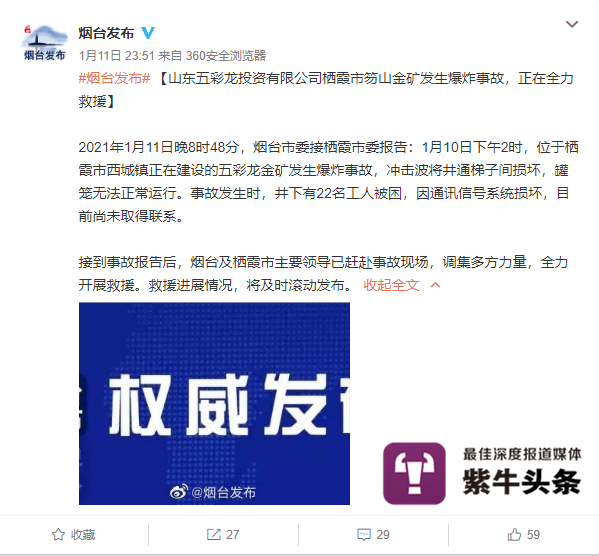 1月10日下午2时,山东省烟台市栖霞市五彩龙金矿发生爆炸事故,共有22名工人被困。根据烟台市应急管理局局长孙树福在新闻发布会上的通报,涉事企业曾于当日事发后组织力量施救,但由于对救援难度估计不足,直到1月11日20时5分才向栖霞市应急管理局报告有关情况。