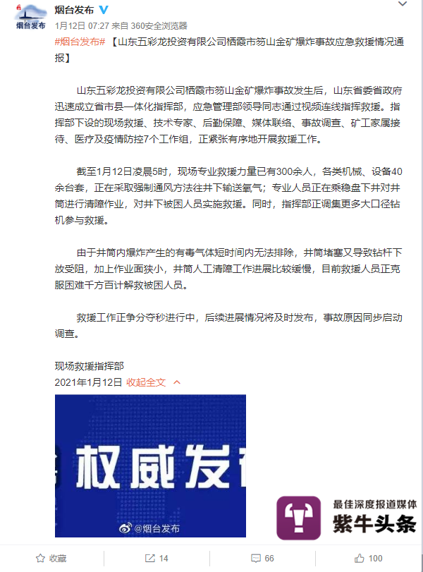 根据官方发布会消息,1月11日晚栖霞市应急管理局接到事故报告后,烟台及栖霞市主要领导及时赶赴事故现场,调集救援力量,全力开展救援。当晚山东省委省政府也成立了省市县一体化指挥部,由国家应急管理部领导指导救援工作。目前,应急管理部副部长、国家矿山安监局局长黄玉治亲率应急部专家工作组,已抵达现场指导救援。国家、省应急管理部门正调集各级专业救援队伍和设备,给予山东栖霞市全方位增援。