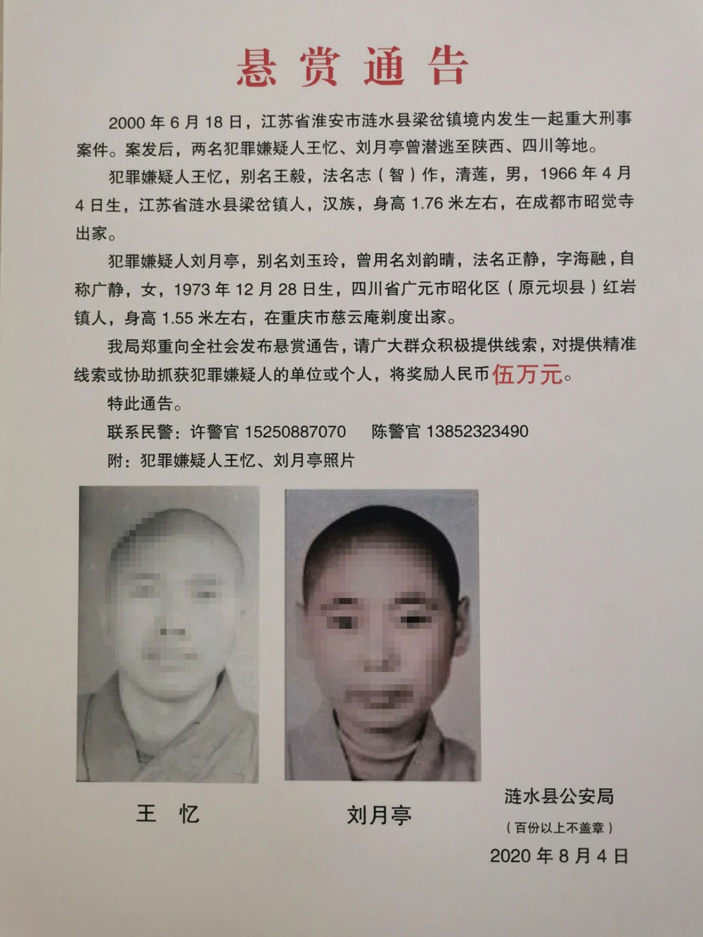 时间追溯到2000年6月的一天,涟水县梁岔镇陈溪村境内东张河内发现一具高度腐烂的女尸,经初步勘查和尸体检验后证实系他杀。案发后,淮安市、县两级公安机关迅速抽调精干警力成立“2000.6.18”专案组,开展侦破工作,通过连续数日的现场勘验、调查走访和重点摸排等大量工作,最终锁定刘月亭(女,当年27岁、四川广元人,法名正静,字海融,自称广静)、王忆(男,当年32岁,涟水人、别名王毅,法名智作、清莲)两人有重大作案嫌疑。