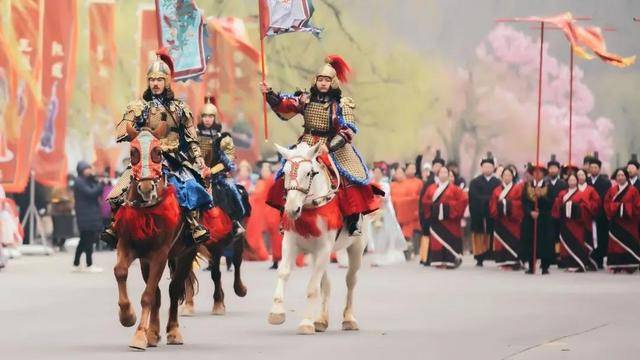 10时许,盛大的开幕式巡游震撼开场。旌旗招展、鼓声震天、马蹄声起,首仪仗方阵气势磅礴,拉开了第三届中国云台山汉服花朝节的序幕;婚礼方阵庄重大气,各朝代婚服展示着丰富多彩、极具内涵的传统服饰文化;礼乐方阵彰显大国礼乐风姿,尽显华夏威仪;民众方阵由数百名来自各地的传统文化爱好者组成,成为一道亮丽的风景线;由汉服推荐官和汉服形象大使扮演的竹林七贤、十二花神翩然而至,与云雾缭绕的云台山水组成一幅美妙的画卷。