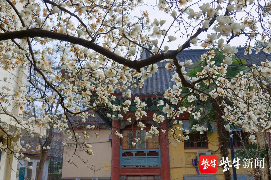 在南京师范大学随园校区,被誉为“东方最美丽的校园”里,古建筑散发着历史的气息,厚重、典雅;而花朵,则为这古意间增添了几分生机与灵气。特别是校花——玉兰花,已悄然盛开,从下仰望,满树的玉兰花层层叠叠与古色古香的建筑相映衬,有种别样的美丽与灿烂。而在众多玉兰花中,尤以图书馆附近的宝华玉兰最为名贵、开得最美丽。