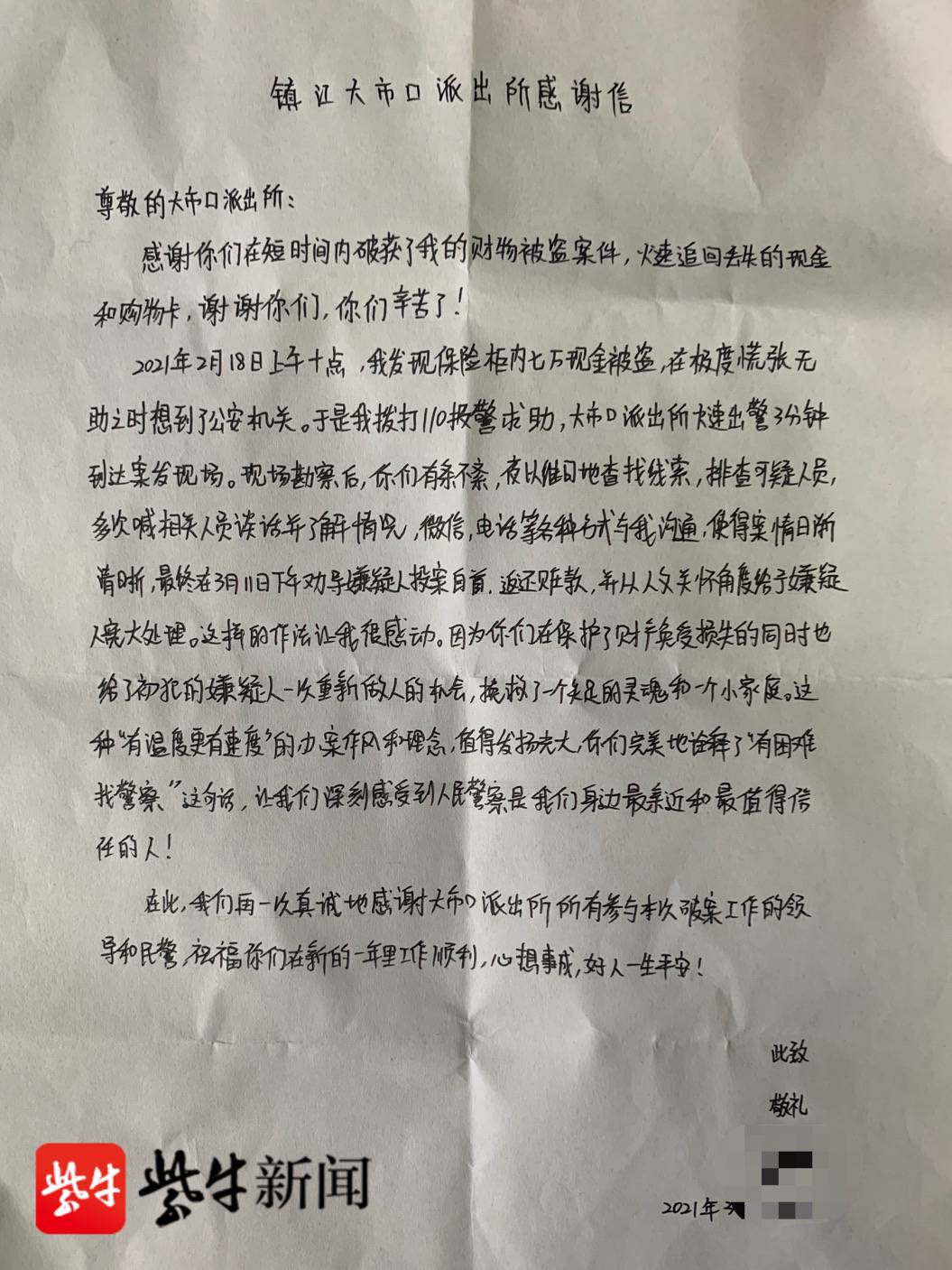 扬子晚报网3月17日讯(通讯员 李茹雪 江天文 记者 万凌云) “你们这种‘有温度更有速度’的办案作风和理念,让我们深刻感受到人民警察是身边最亲近和最值得信任的人!”3月16日,王经理送给镇江市京口公安分局大市口派出所一封表扬信,她在信中说道。