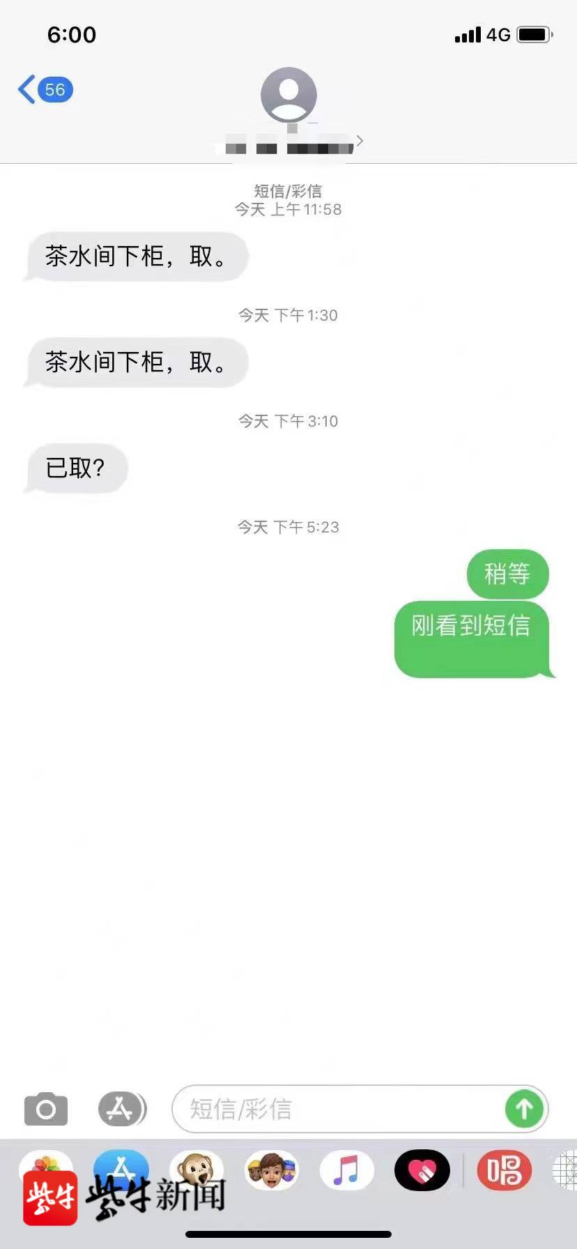 3月8日中午12点左右,王经理接到了一条陌生号码发来的短信,内容为“茶水间下柜,取。”王经理看到后,第一时间联系到民警,并前往公司茶水间下柜查看。当即,发现了一个棕色布袋!
