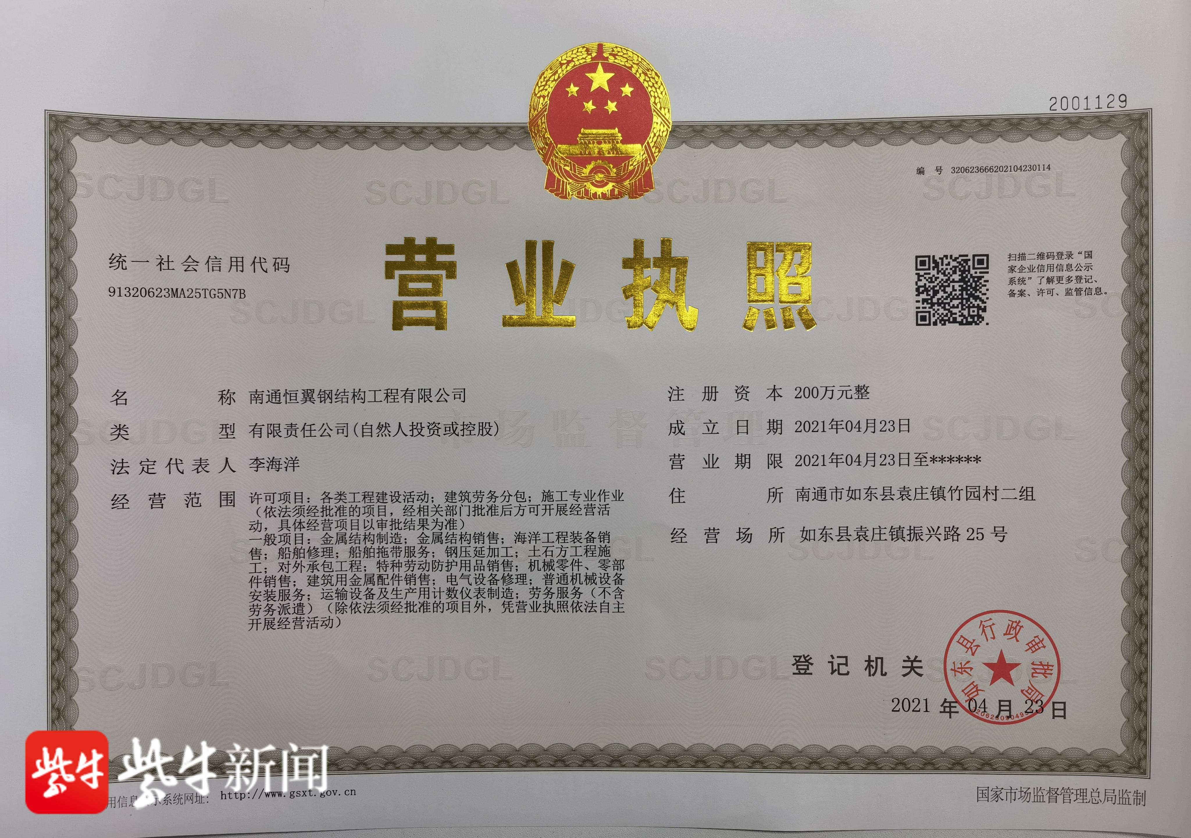 4月23日,南通恒翼钢结构工程有限公司的经办人金先生,在如东县政务服务中心领到一张载有公司住所和经营场所两处地址的营业执照。这是南通市在如东试点“住所和经营场所分离登记”改革后,颁发的首张“住所和经营场所分离”营业执照。