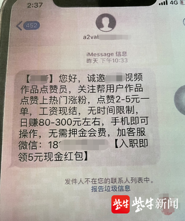据小庄介绍,前一天晚上,突然收到某短视频平台发来的一条短信,内容为:诚邀点赞员,2-5元一单,日赚80-300,无需押金会费,有意向可添加好友。出于好奇,小庄试着搜索了这个号码,想着就是给短视频点赞,也没有什么风险,于是添加了对方为好友。很快,对方发来一个二维码,并把小庄拉进了一个聊天群,称扫码下载APP登记后,群里会有人教他具体怎么操作。果然,一个自称群主的人开始在群里发布任务,小庄按指导关注点赞后,马上盈利了10元。对方随即要了小庄的收款码并把钱转给了她。