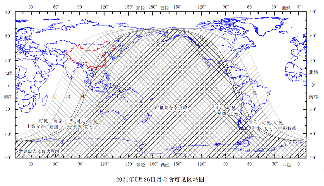 据专家介绍,当天新西兰可见月全食全过程,我国东部地区可见月全食,但都是月出带食。这次月食,在亚洲东部、大洋洲、太平洋大部、北美洲(除东北部),南美洲(除极东部)及南极洲可以看到。中国除西藏极西部、新疆极西部外,其他地区可见月亮带食而出。