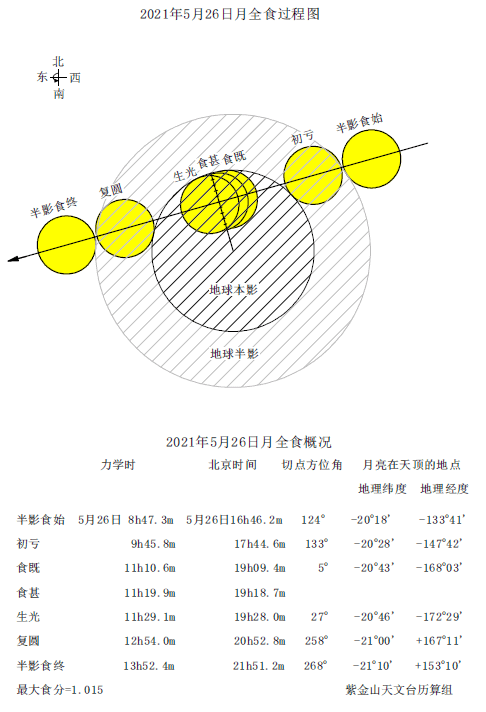 当天19时14分,太阳、地球和月球排成一条直线而发生月全食(望)。这次,月亮距离地球最近与月亮最圆,两者仅相差9小时,因而是名副其实的“超级月亮”,值得观赏和拍摄。天文预报显示,半影食始的时间为: 16:46:12,初亏:17:44:36,食既:19:09:24,食甚:19:18:42,生光:19:28:00,复圆,:20:52:48,半影食终的时间为:21:51:12。最大食分=1.015
