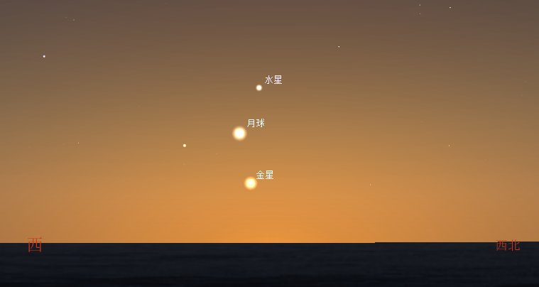 5月14日2时,水星合月,日落后可见于西边低空。和13日相比,月球位置更高,月牙变得更宽一些。
