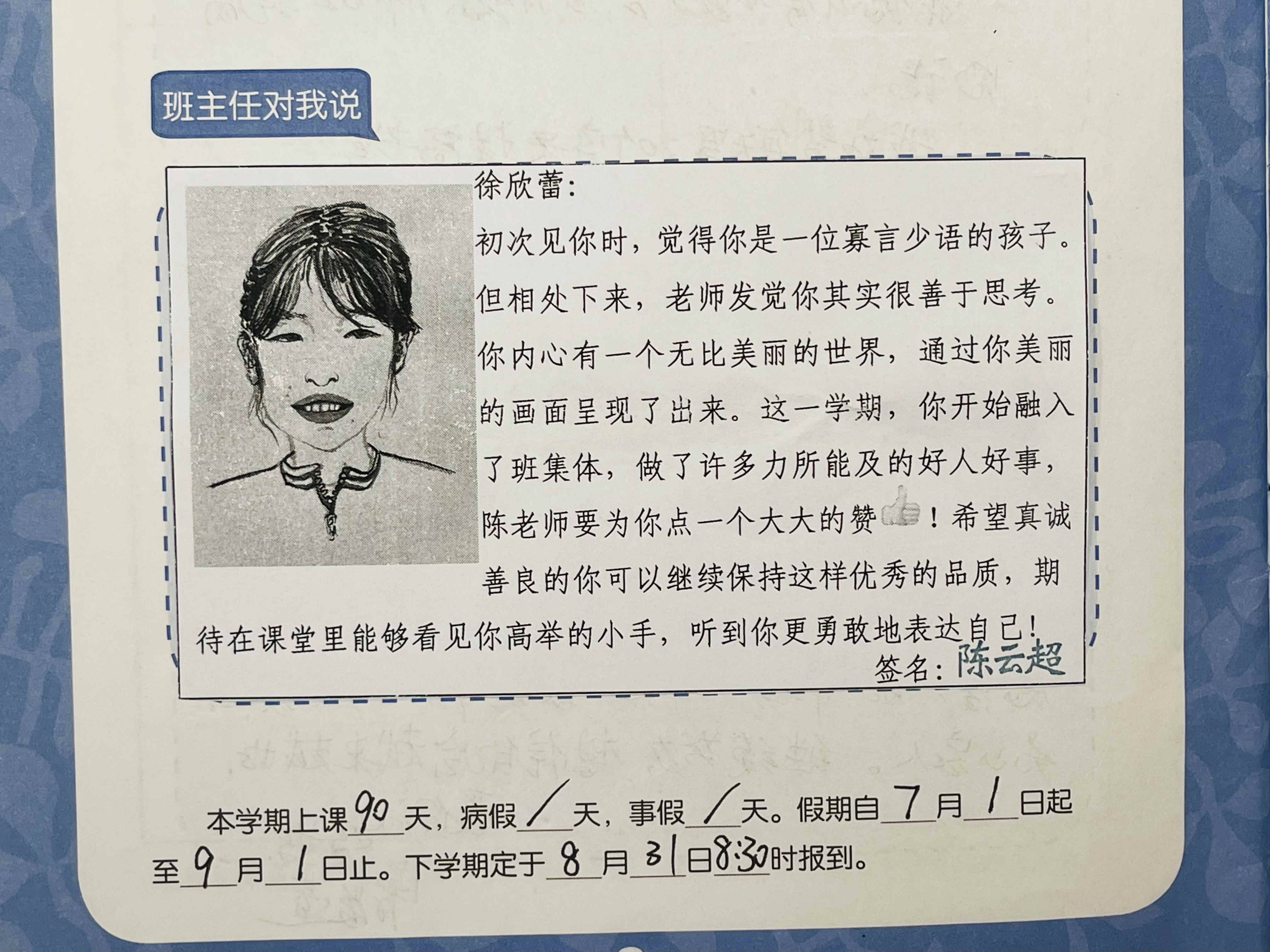 自从当上了班主任,细心的陈老师就把办公桌搬进了教室,常常在课间与同学们互动交流。身为美术老师的她总想用自己的专长为孩子们做点什么。在有孩子班委竞选失利时,陈老师会手绘一个小奖牌,然后写上“加油,继续努力!”;当有孩子在学习中遇到困惑,手足无措时,陈老师也会用连环漫画来帮助他寻找前行的动力。临近学期末,平日里有画小幅肖像画爱好的陈老师,又在琢磨:“如果能为每个孩子画幅肖像画,把它贴到评语上去,那该多有意思啊!”于是41份带有手绘肖像画的特色评语诞生了。