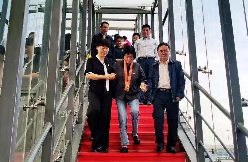 18时46分,飞机舱门缓缓打开,捧着鲜花的张桂梅出现在舱门口,胸前挂着“七一勋章”的她依然穿着那件熟悉的黑衬衫。一下飞机,张桂梅感叹:“今天终于回家了”。