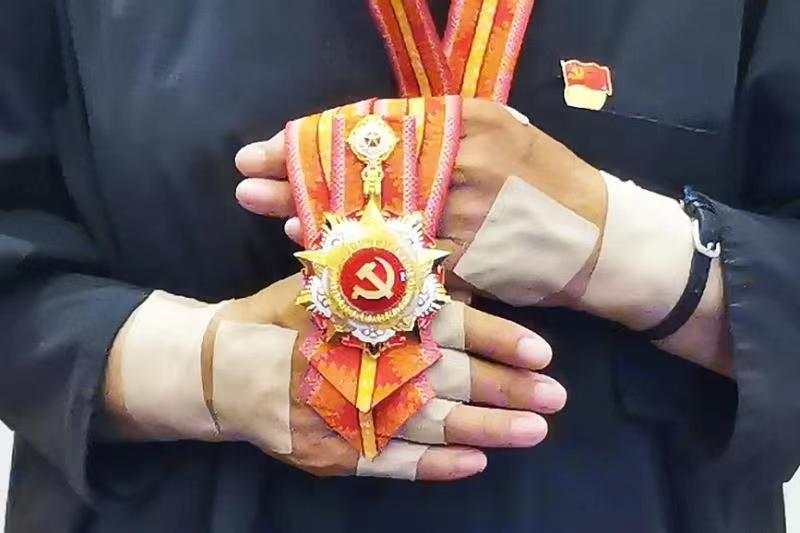 “只要还有一口气我就会站在讲台上,九死亦无悔,这是我对党中央、全国党员和人民作的保证,我会做到的。”张桂梅眼神坚定地说,捧着勋章的双手依旧贴满膏药。