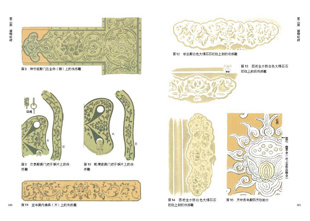 按照伊东忠太等人在书中的描述,紫禁城中使用的纹样种类主要有三种:自然纹样(包括动物、植物、天体或自然现象的纹样)、几何纹样、人工纹样。