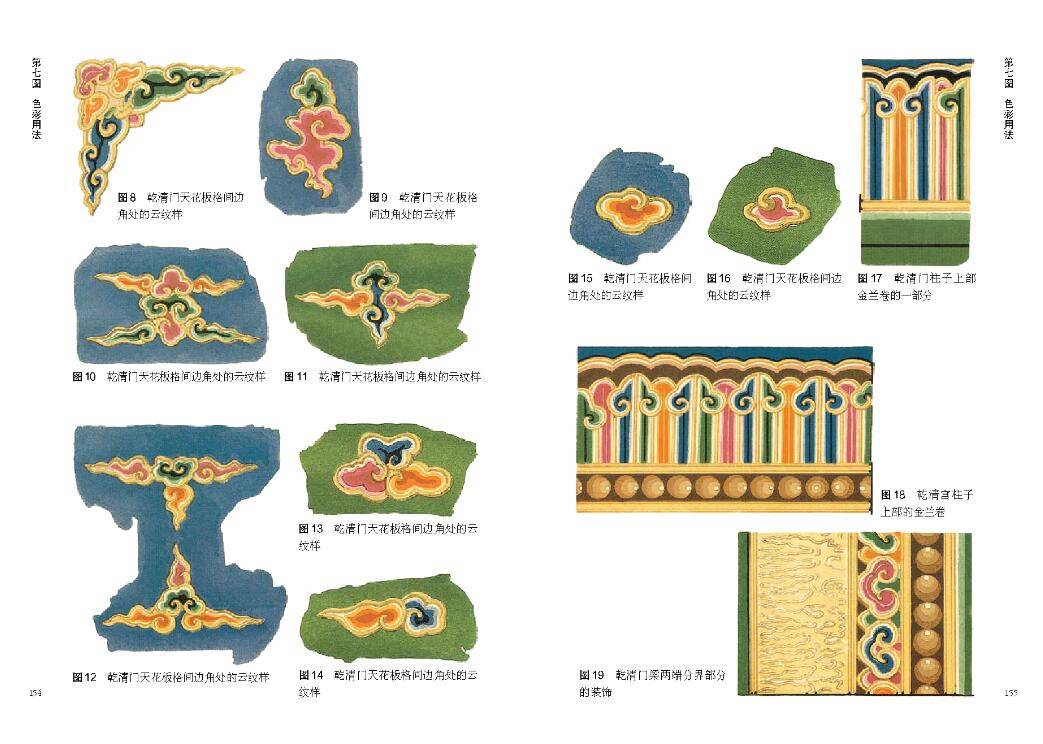 《手绘紫禁城:遗失在日本的北京皇城建筑艺术》一共分为四章,前三章分别从皇城建筑装饰纹样的种类、组合、简化和皇城建筑的装饰色彩等方面,对紫禁城的明清建筑的总体特点、总体布局、纹饰颜色细节以及紫禁城建筑的总体进行了评价。而第四章则完全是从细节部分对紫禁城的纹样、色彩、构造等方面进行了全面的展现。
