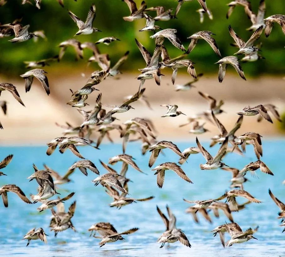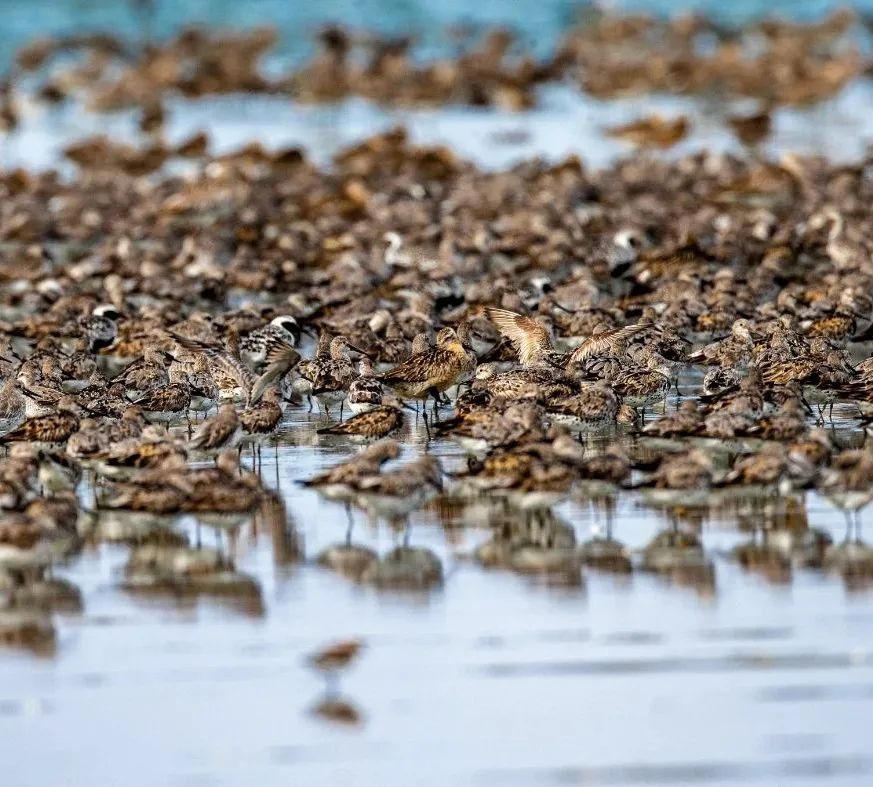 近日,大批由北向南迁徙的候鸟“先头部队”,飞临东台条子泥湿地。此次飞来的鸟类中,有大滨鹬、小青脚鹬、黑腹滨鹬、斑尾塍鹬等鸻鹬,以及黑脸琵鹭、鸥类候鸟等。飞行场面壮观,令人震撼。