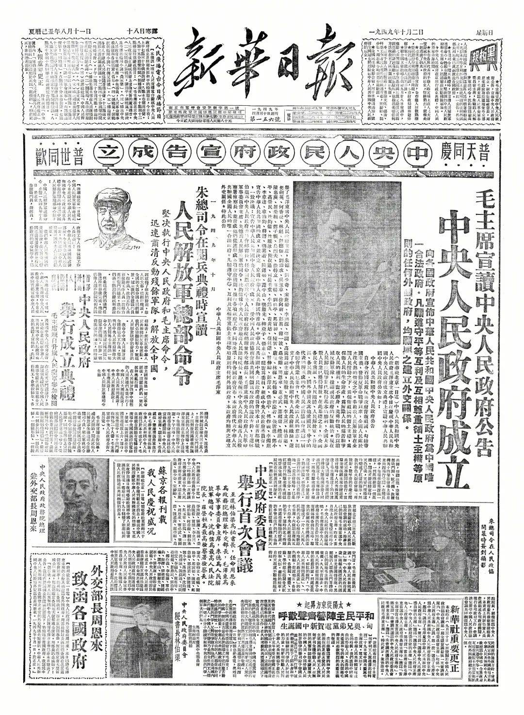 1949年4月30日,南京解放7天后,《新华日报》在南京复刊。当年10月1日,举世瞩目的中华人民共和国开国大典在天安门广场举行。次日,《新华日报》头版用大幅标题刊登新华社消息——《毛主席宣读中央人民政府公告 中央人民政府成立》。标题左侧,一张竖版照定格了毛泽东在天安门城楼向世界宣告新中国成立的历史瞬间。
