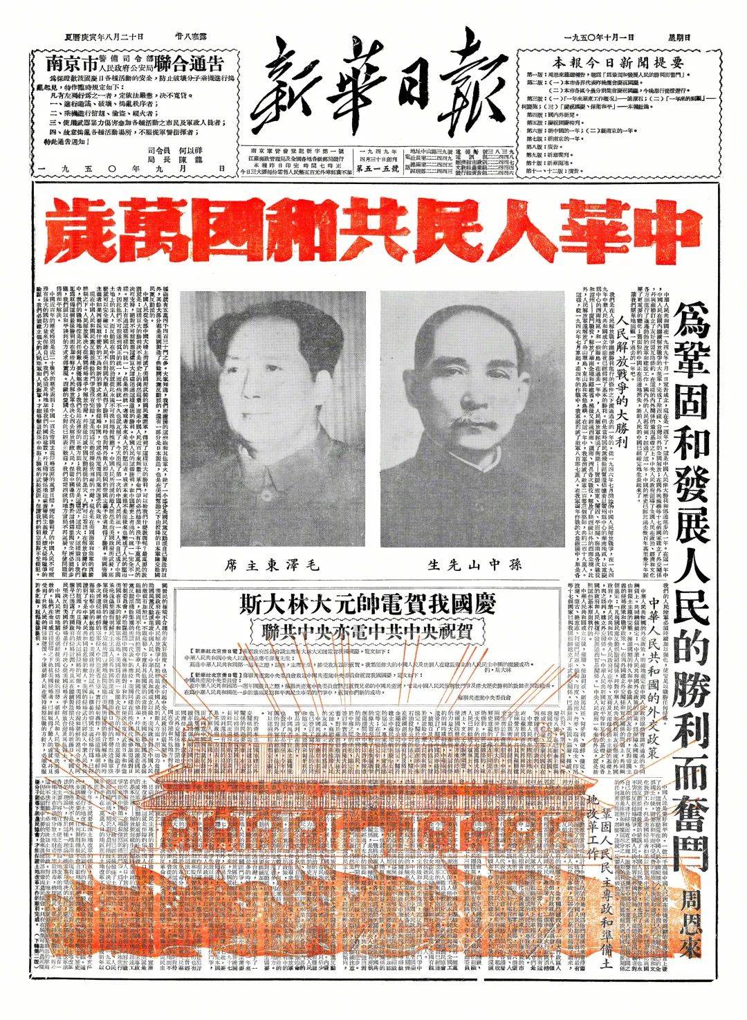 新中国成立一年后,社会秩序稳定,生产建设等各项工作步入正轨,从当年国庆版的精心设计中,不难看出这些变化。1950年10月1日《新华日报》头版,“中华人民共和国万岁”9个粗体红字居于版面正上方,正中是毛泽东和孙中山的两幅大型照片。版面下方,一幅天安门城楼前红旗招展的图像影印在文字背后,设计精美而庄严,十分现代。
