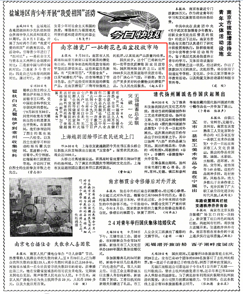 1980年国庆,《新华日报》头版刊登的一则抢购新花色面盆的消息生动有趣,南京市人民商场和南京市新街口百货商店的搪瓷柜台销售印有“反弹琵琶”“芙蓉金鱼”“蝴蝶牡丹”等图案的面盆,深受市民欢迎。
