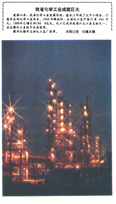1989年国庆,天气多云到晴,微风和煦,气温适宜,最高温度25℃-26℃。当天《新华日报》头版左下角一张彩色照片,配文:“1949年解放时,全省化工总产值只有444万元,1988年已增长到195.8亿元。化工已成为我省六大工业支柱之一,在全国化工系统中位居前茅。”图片上是灯火辉煌的无锡市石化总厂,厂区在夜色中闪烁着金黄色暖光。
