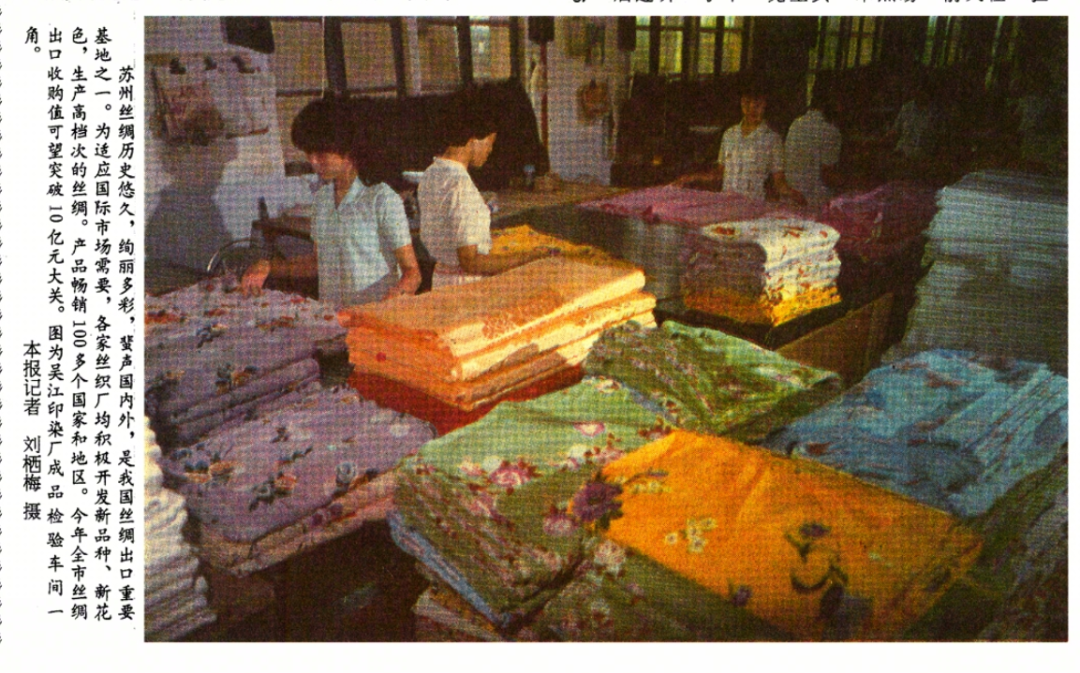 1990年,《新华日报》国庆头版右下角,一张几乎囊括赤橙黄绿青蓝紫的照片,直观地讲述苏州丝绸适应国际市场需求,积极开发新品种、新花色,畅销100多个国家和地区的故事,开放大省崭露头角。