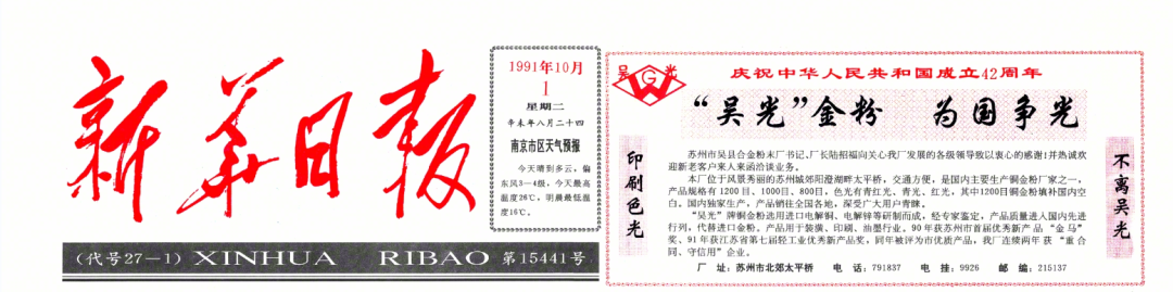 1991年国庆,《新华日报》头版报眼位置出现一则广告——《庆祝中华人民共和国成立42周年 “吴光”金粉 为国争光》。“苏州市吴县合金粉末厂是国内主要生产铜金粉厂家之一,产品规格有1200目、1000目、800目,色光有青红光、青光、红光,其中1200目铜金粉填补国内空白。”这则广告展现了江苏经济的稳步发展。1992年邓小平视察南方之后,报纸版面上商业广告逐渐成为“常客”。