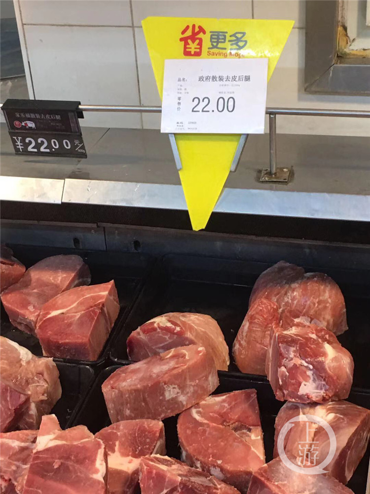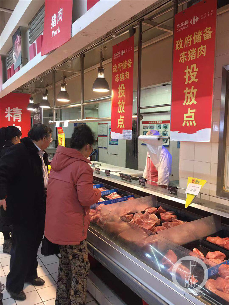 上游新闻·重庆晨报记者在家乐福南坪店看到,在超市猪肉档口政府储备肉销售点,都贴上了政府储备冻猪肉投放点的海报,22元一斤的政府储备冻猪肉,吸引了不少市民前来挑选。