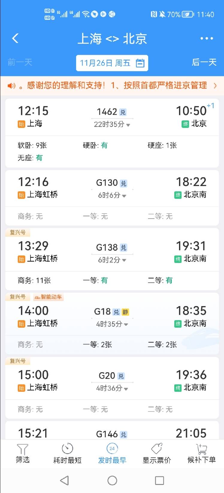 11时40分,上海到北京各次列车的车票售卖情况。铁路12306App截图