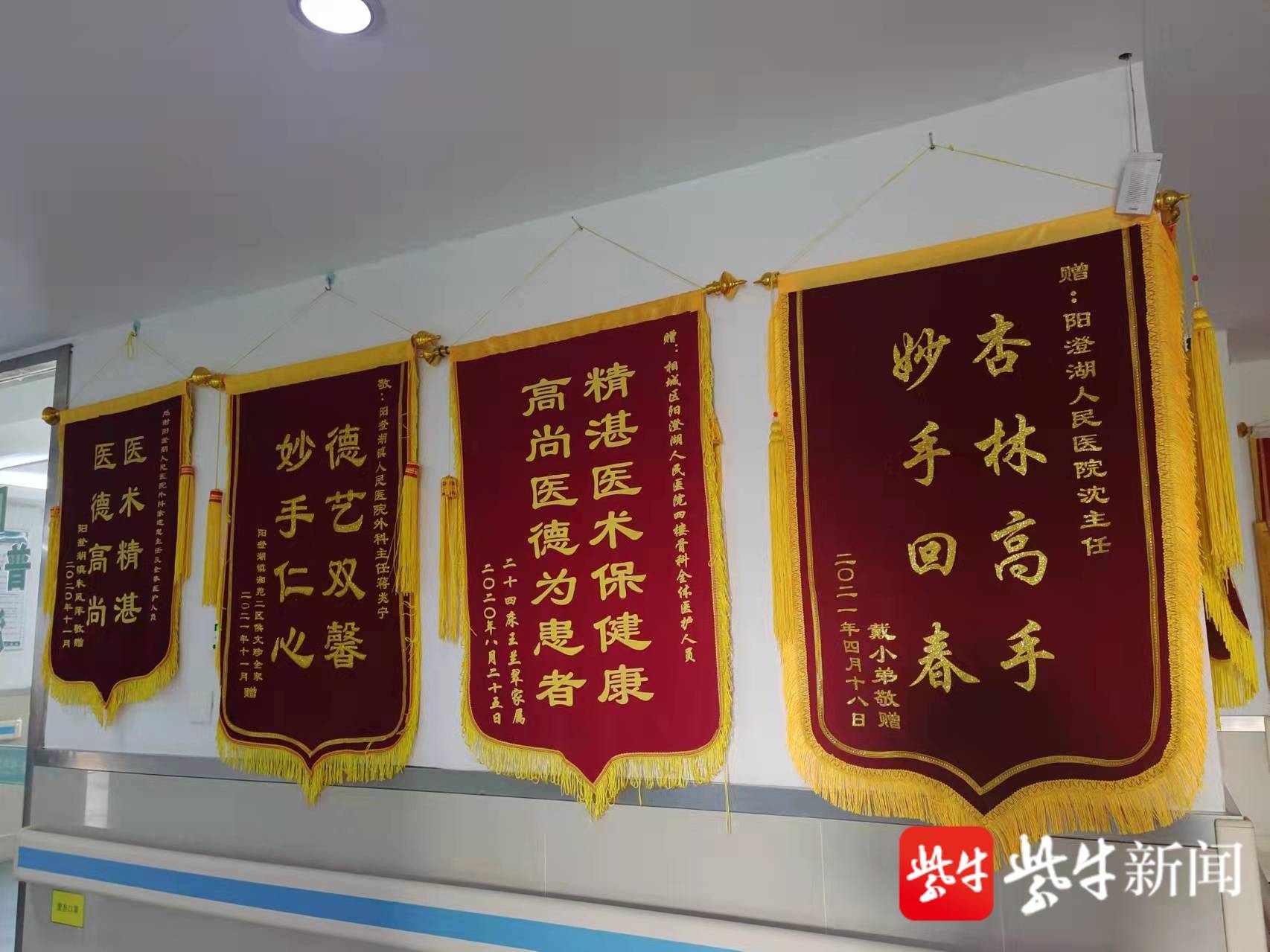 走进苏州市相城区阳澄湖人民医院的外科病区,一进门就能看到挂着一长排锦旗的墙壁,这就是该病区著名的“锦旗墙”。各种风格的旗帜上写着各类感谢话语,这些都是患者们发自内心想要感谢这里的医护人员而定制了以后亲自送来的。