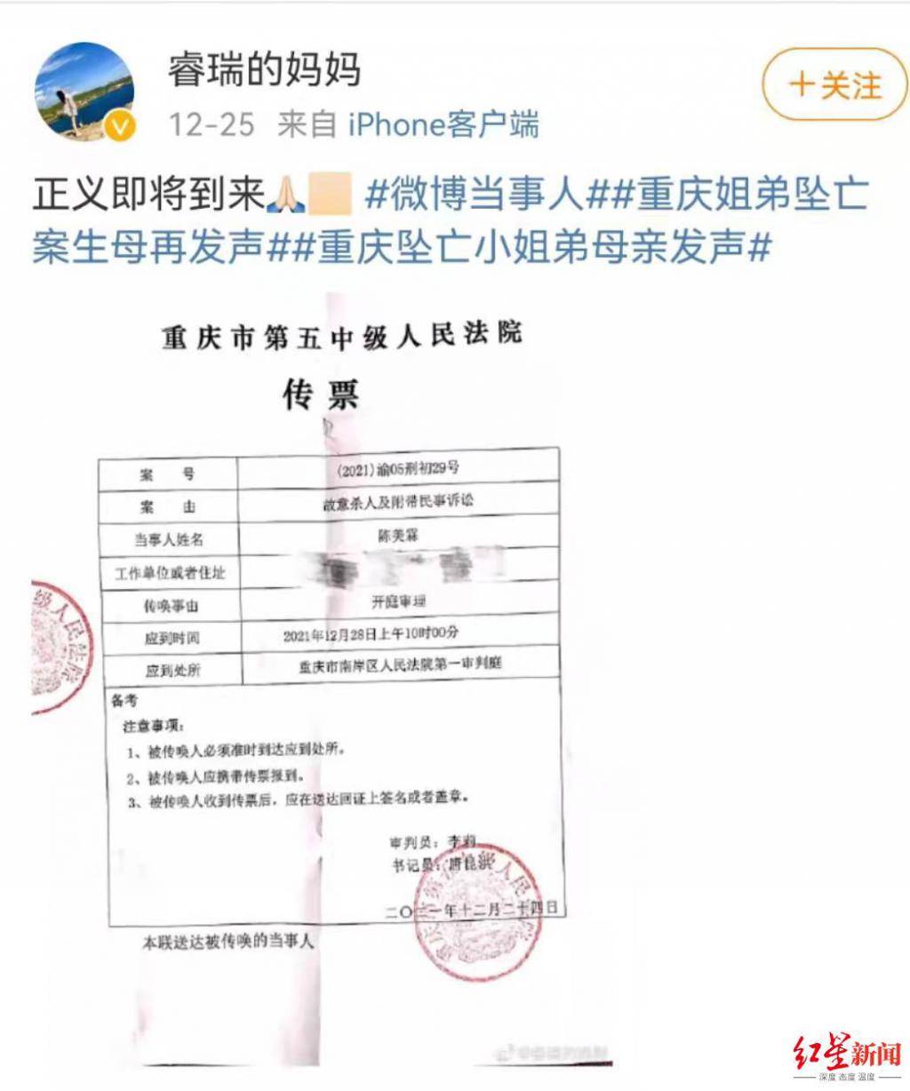 红星新闻曾报道《重庆两幼童坠楼案月底开庭 检方以 " 故意杀人 " 对孩子生父提起公诉》一案,孩子母亲陈美霖近日收到法院传票,该案将于明日(12 月 28 日)上午 10 点在重庆市第五中级人民法院再次开庭审理。陈美霖了解到,此次开庭一审将宣判。此前,在 7 月 26 日,法院曾开庭审理此案,法院当日宣布休庭,将择期宣判。