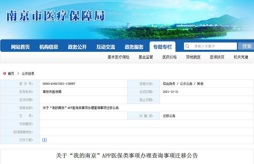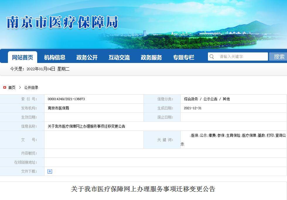 因机构改革和职能调整,从2022年1月1日00:00起,南京市人力资源和社会保障局网站“南京人社网上办事服务大厅”、“我的南京”APP“智慧人社”栏目不再办理涉及医疗保险(生育保险)的公共服务事项。南京市人力资源和社会保障咨询服务热线12333不再提供涉及医疗保险(生育保险)的政策咨询及查询服务(人工及自助语音)。上述事项办理和查询由南京市医疗保障局承办。