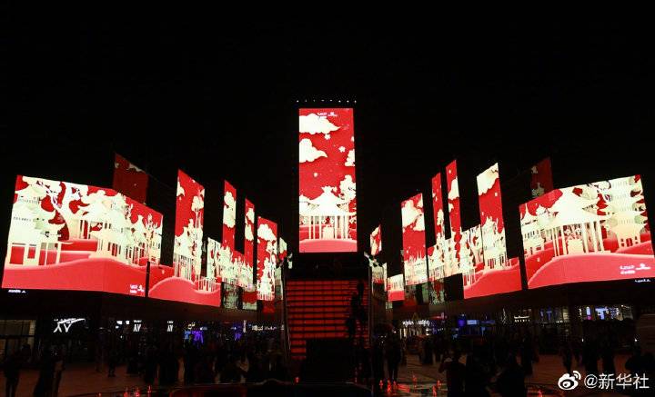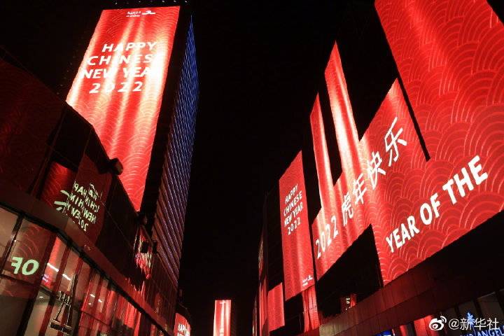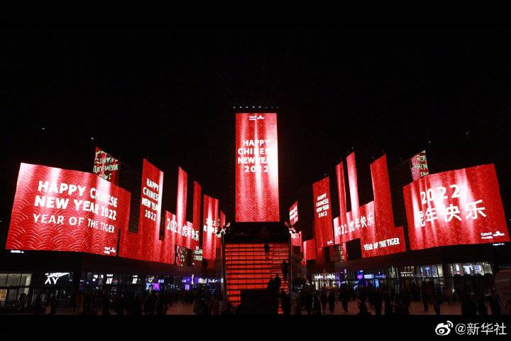 2月3日晚,沙特阿拉伯首都利雅得的“利雅得城市大道”广场数十块LED屏幕播放庆祝春节的主题视频。视频以红色为主色调,既有中国古建筑、红灯笼等画面,也有中英文的“虎年快乐”等字样。这是沙特首都利雅得首次点亮“中国红”以庆祝中国春节。
