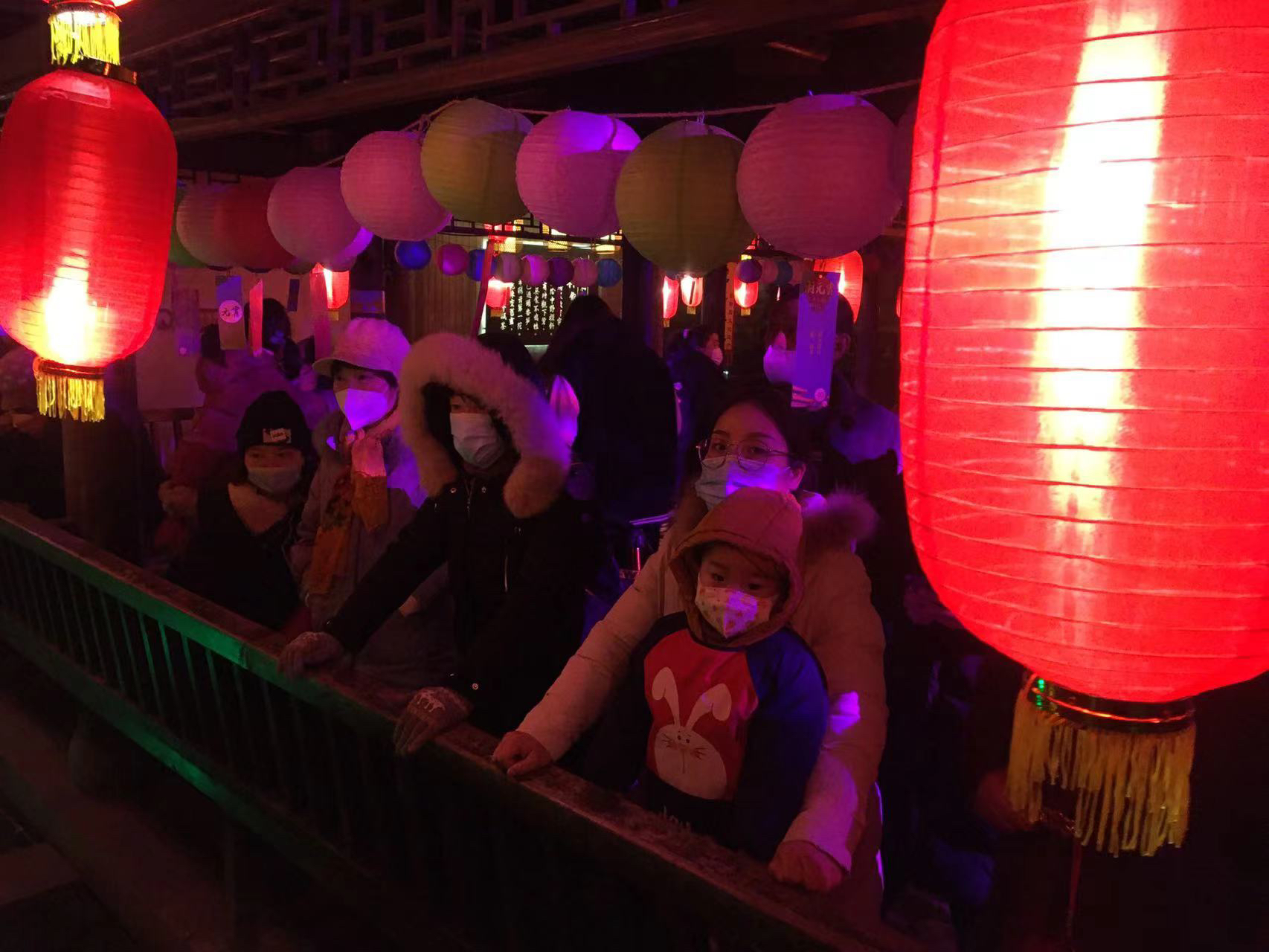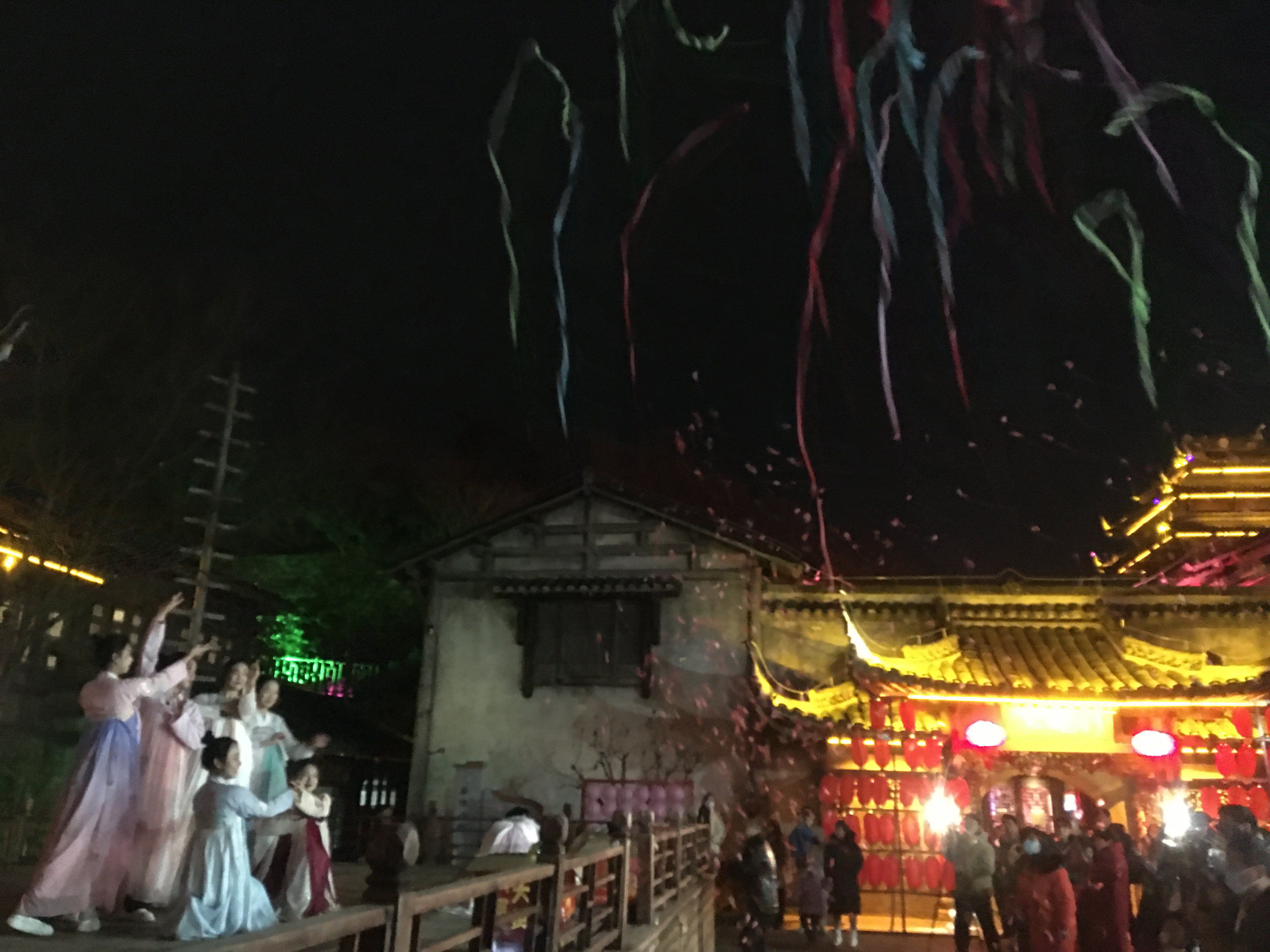 元宵佳节,位于句容宝华山千华古村内,灯光璀璨。红红的灯笼,挂满了具有明清风格的古村街道,美轮美奂璀璨的花灯倒映在水中,水光灯影两相融,渲染出古典诗意。流动的人群,与花伞、花灯相映成趣,月上柳梢头。