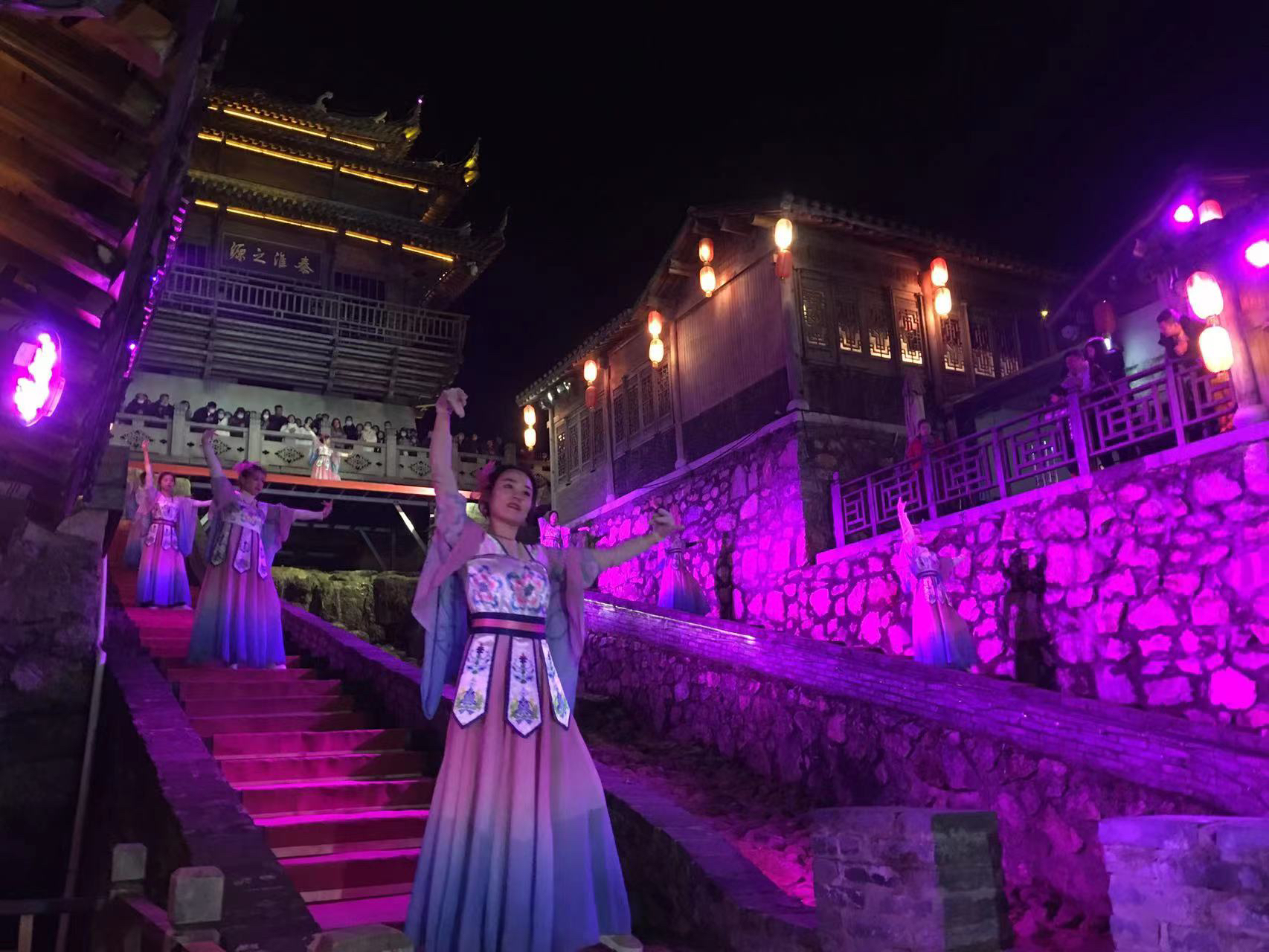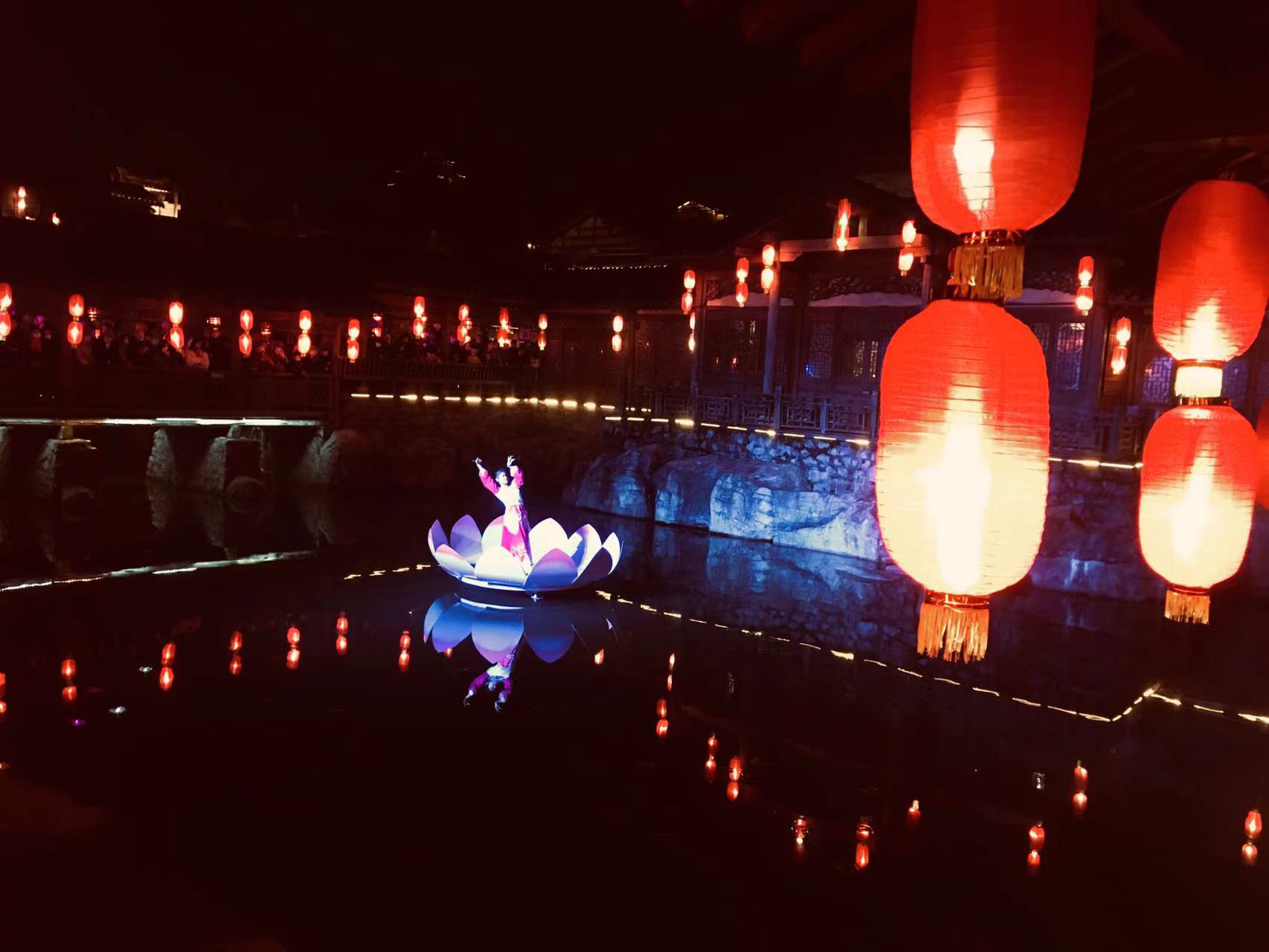 走进古色古香的千华古村,映入眼帘的就是热闹繁华的非遗市井文化一条街,舞龙、舞狮、抖空竹等民俗表演,活跃节日氛围。晚上7点,秦淮水阁处大型古装情景剧舞蹈“梦秦淮”穿越秀“秦淮之源再寻梦”正绚丽上演,舞蹈演员身着汉、唐、宋、元、明、清等不同时代的古典服饰,翩翩起舞,上演一场美轮美奂的时空穿越秀。