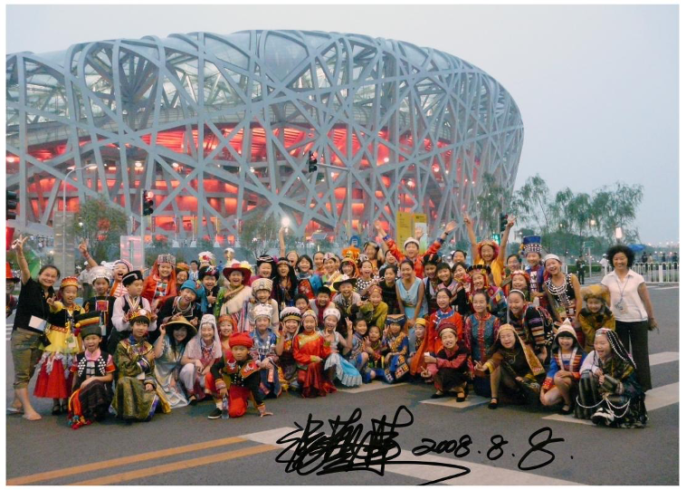 参与2008年北京奥运会开幕式的合唱团孩子在鸟巢前合影