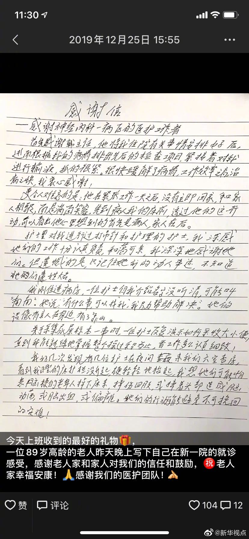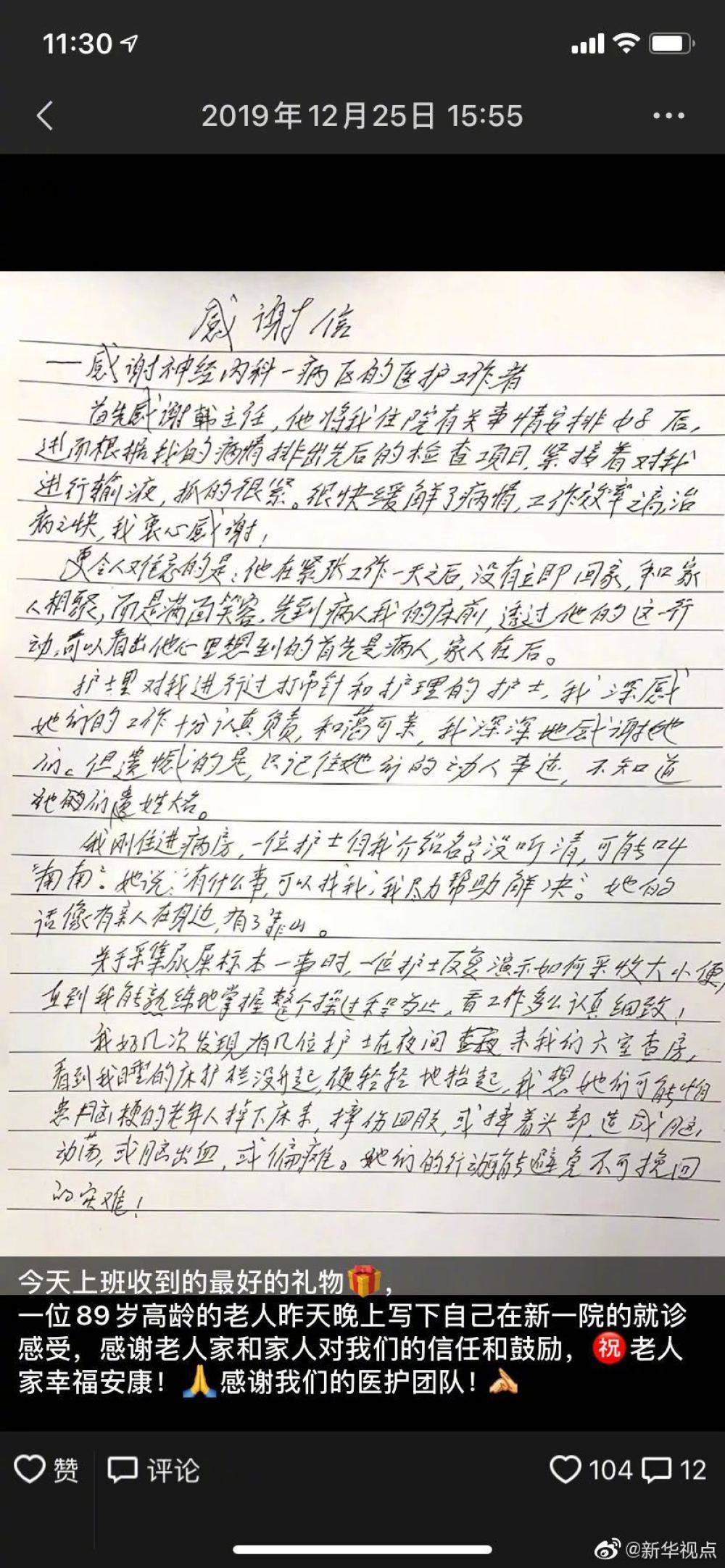 写感谢信的老人叫黄廷干,2019年12月20日,老人因头晕来到徐州市第一人民医院就诊,韩献军是其主诊医生。在12月25日查房时,韩献军无意中看到了老人这封感谢信。