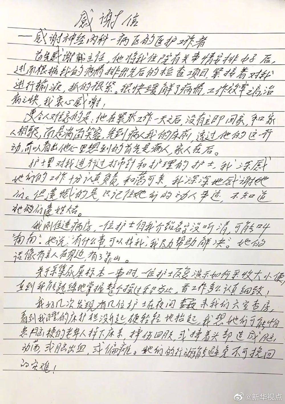 “看到我睡的床护栏没升起,便轻轻地抬起,我想他们可能怕患脑梗的老年人掉下床来摔伤。”这是黄廷干信中的一段文字。黄敬华说,父亲在住院时,对这些令他感动的细节专门做了笔记,出院后又写了满满两张纸的感谢信。父亲在信中还特意交代,一些照护他的护士记不住姓名,希望让护士长一并转达感谢。(记者 郑生竹)