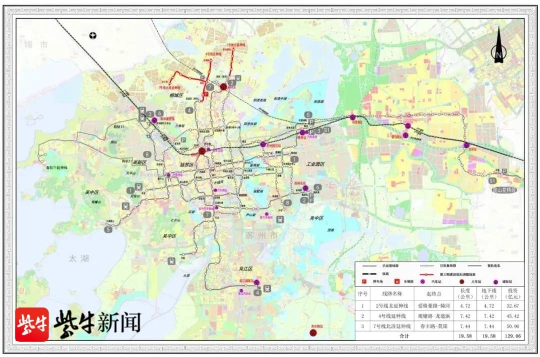 据了解,本次调整涉及2、4、7号线北段延伸,总长19.58公里,总投资129.06亿元。其中,2号线北延伸线:起于爱格豪路站,终于骑河站,长约4.72公里,均为地下线,实现与苏州北站、苏州市中心的直达联系,支撑高铁新城联通渭塘的 “城市功能发展轴”。