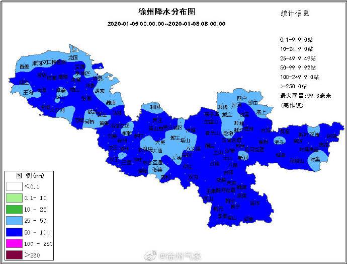 江苏新年的第一场雪,下在了徐州和连云港,据@徐州气象,受北方冷空气和西南暖湿气流的共同影响,5日凌晨到7日早晨徐州普降中到大雨,7日上午开始自北向南逐渐转为雨夹雪或小到中雪,丰沛县达到了大雪量级,目前降水已全部结束。最大降水量99.3毫米(睢宁高作镇)。